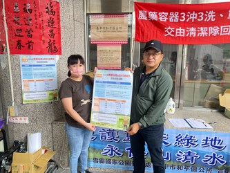 環保局長陳宏益表示,今年上半年度6場次民眾參與踴躍,農藥廢容器回收1萬3,128個,飲料玻璃瓶1,740個,感謝民眾對於回收工作熱情與支持。再次呼籲請勿隨意丟棄農藥空瓶,瓶內殘留的農藥將對環境造成二次污染,更可能危害人體健康;另已破碎之廢玻璃容器應妥善包裝、標註警語回收,避免收運及分類時造成人員受傷。