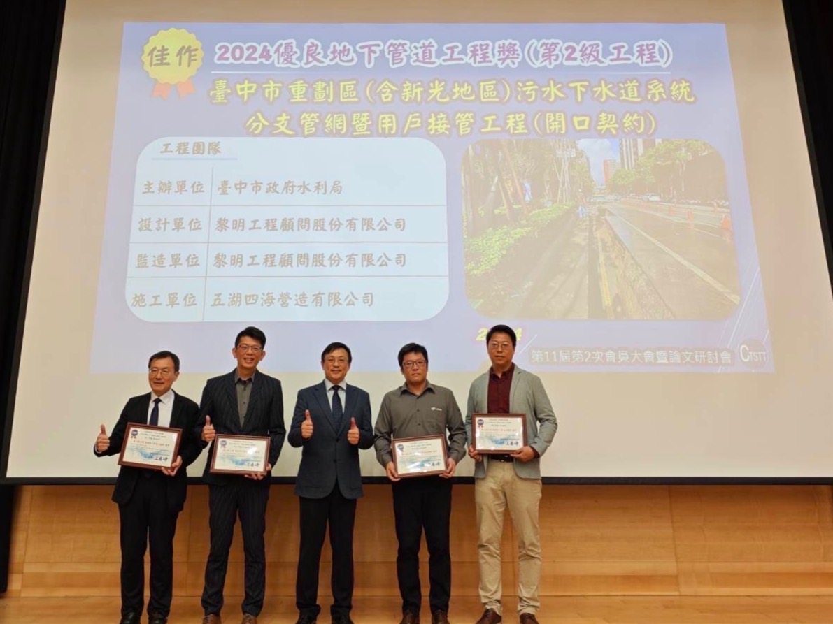 113年度優良地下管道工程頒獎典禮今(4)日於國立台北科技大學集思會議中心盛大舉行,台中市政府水利局以「水湳經貿園區(敦化路延伸段)污水下水道銜接工程」及「台中市重劃區(含新光地區)污水下水道系統分支管網暨用戶接管工程(開口契約)」分別榮獲工程獎(第二級)優等與佳作殊榮,顯見中市府於積極推動下水道建設及污水用戶接管備受肯定。