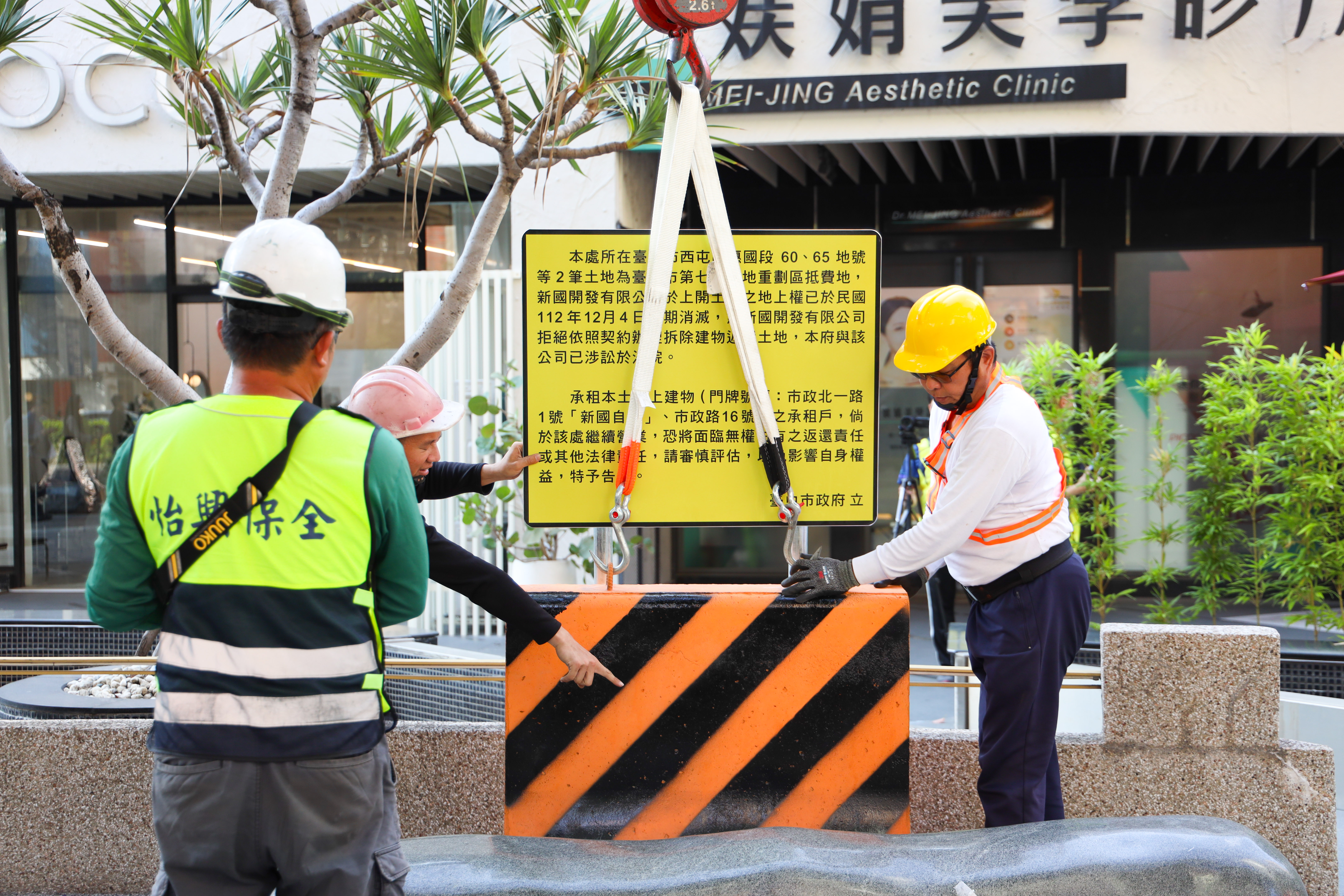 地政局說明,新國自在商場(台中市西屯區市政北一路1號)與星期五美式餐廳(台中市西屯區市政路16號)為新國開發有限公司未依約拆除的地上建物,目前仍有眾多商家持續營運,地政局已委任律師寄送存證信函通知各商家,卻均遭該公司退回;且該公司仍有招攬新商家入駐情形,為免影響商家權益,市府今日於惠國段60、65地號等2筆土地上放置告示牌,以周知現有及潛在的承租商家。