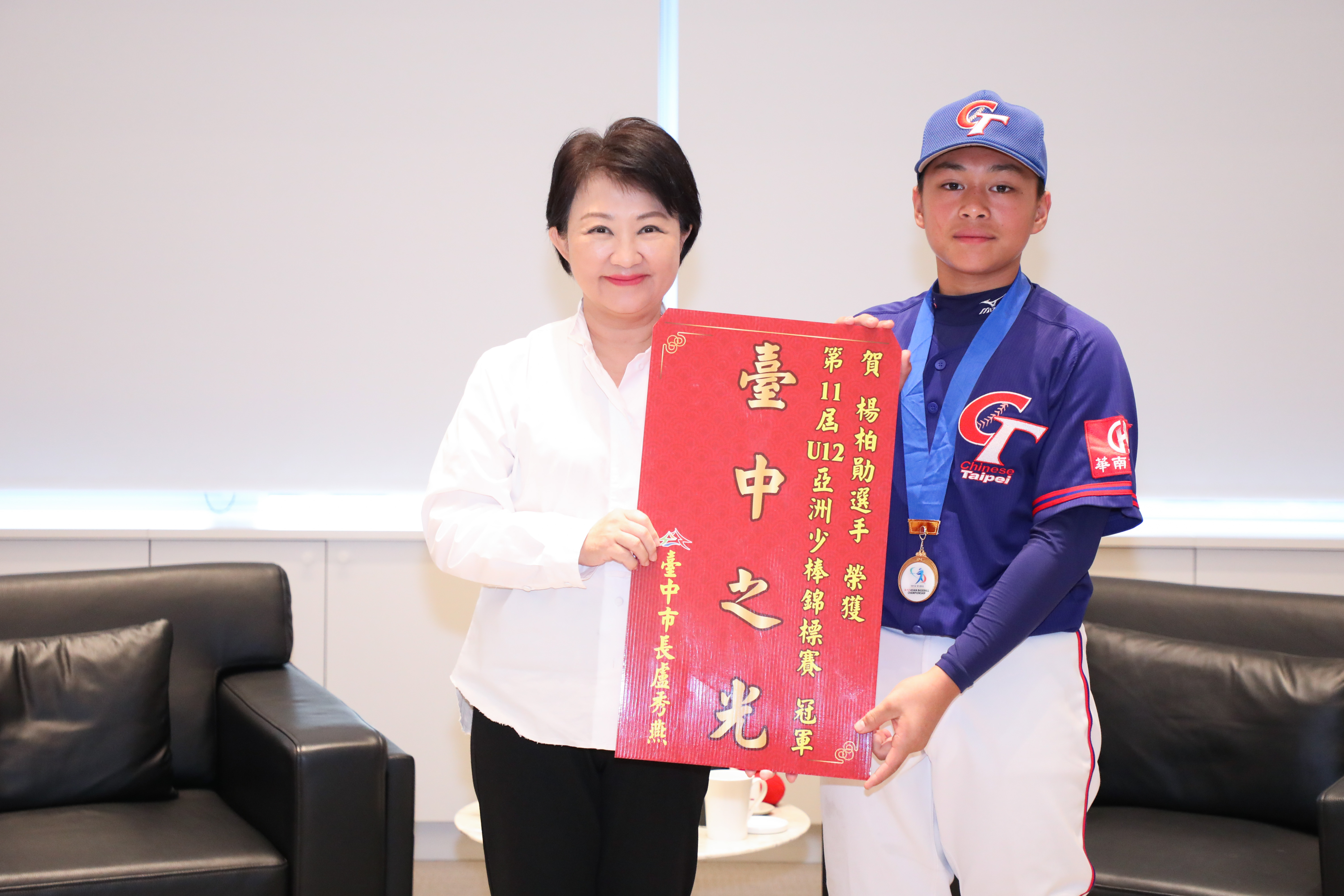 台中棒球小將再創亞洲傳奇!在「2024年第11屆U12亞洲少棒錦標賽」中,忠孝國小的田允祈、黃力垣,以及自由國小的楊柏勛,三位台中小將代表中華少棒隊參賽並奪下冠軍,其中黃力垣更榮獲大會MVP,用精彩表現為台灣與台中爭光。台中市長盧秀燕昨(11)日以最高規格接待這三位小英雄,除了致贈體育獎金,更準備了神秘禮物,讓小將們當場開箱。結果禮物竟是他們許願最想要的—棒球手套!三位小將開心不已,小將也回贈簽名球給盧市長,現場氣氛溫馨感人,成了今年最棒的聖誕交換禮物。