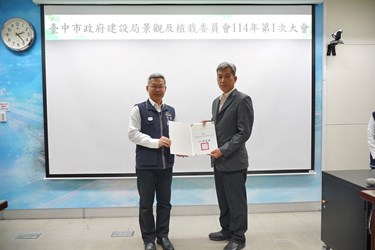 為持續維護市容景觀與樹木健康,台中市政府建設局昨(20)日召開景觀及植栽委員會114年度第1次大會,由建設局長陳大田親自頒發聘書予13位續任委員及3位新任委員,感謝續任委員過去的貢獻與付出,同時期待未來透過委員們的專業知識,繼續維護並提升城市景觀。