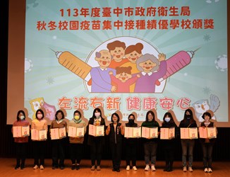 今頒獎典禮氣氛熱絡,衛生局感謝全市國小、國中及高中(職)等各級學校對防疫支持及疫苗接種政策的協助,共同守護校園學童健康的努力。另也呼籲符合新冠及流感疫苗民眾可運用台中市疫苗預約平台預約接種( https://gov.tw/hhv ),或至衛生局網站( https://www.health.taichung.gov.tw/90259/Lpsimplelist )查詢合約院所預約,為自己及家人的健康儲值雙重保障。