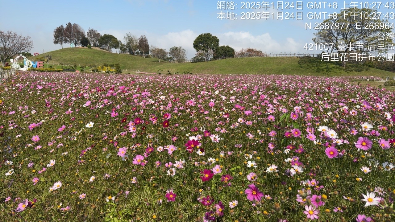 台中市長盧秀燕重視公園綠地的維護與品質,為提供市民春節期間優質的遊憩環境,市府建設局於后里環保公園精心打造1.5公頃的大波斯菊花海,分為三期種植,花海呈現白色、粉紅色、紫紅色等繽紛色彩,成為年節期間市民走春賞花的最佳選擇。花海現正盛開,是春酒聚會及賞花的絕佳時機,並將持續綻放至元宵節,邀請市民前來感受繽紛花景與節慶氛圍。