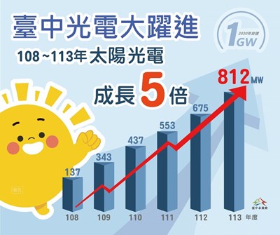 台中太陽光電大躍進!台中市政府積極推動有成,市長盧秀燕上任至今太陽光電裝置容量大幅成長超過 5 倍,預期盧市長任內可達1百萬瓩(GW)目標。依台電公司截至113年底統計,台中市太陽光電裝置容量達81.2萬瓩,相當於1.4座燃煤機組,且相較108年裝置容量13.7萬瓩成長幅度高達5倍,每年可產出綠電逾8.8億度,相當於多供給24萬戶一般家庭年用電量,以市府人口統計設籍戶數112萬戶估算,等同於台中市住宅每100戶就有22戶可為綠電自給自足零碳宅!