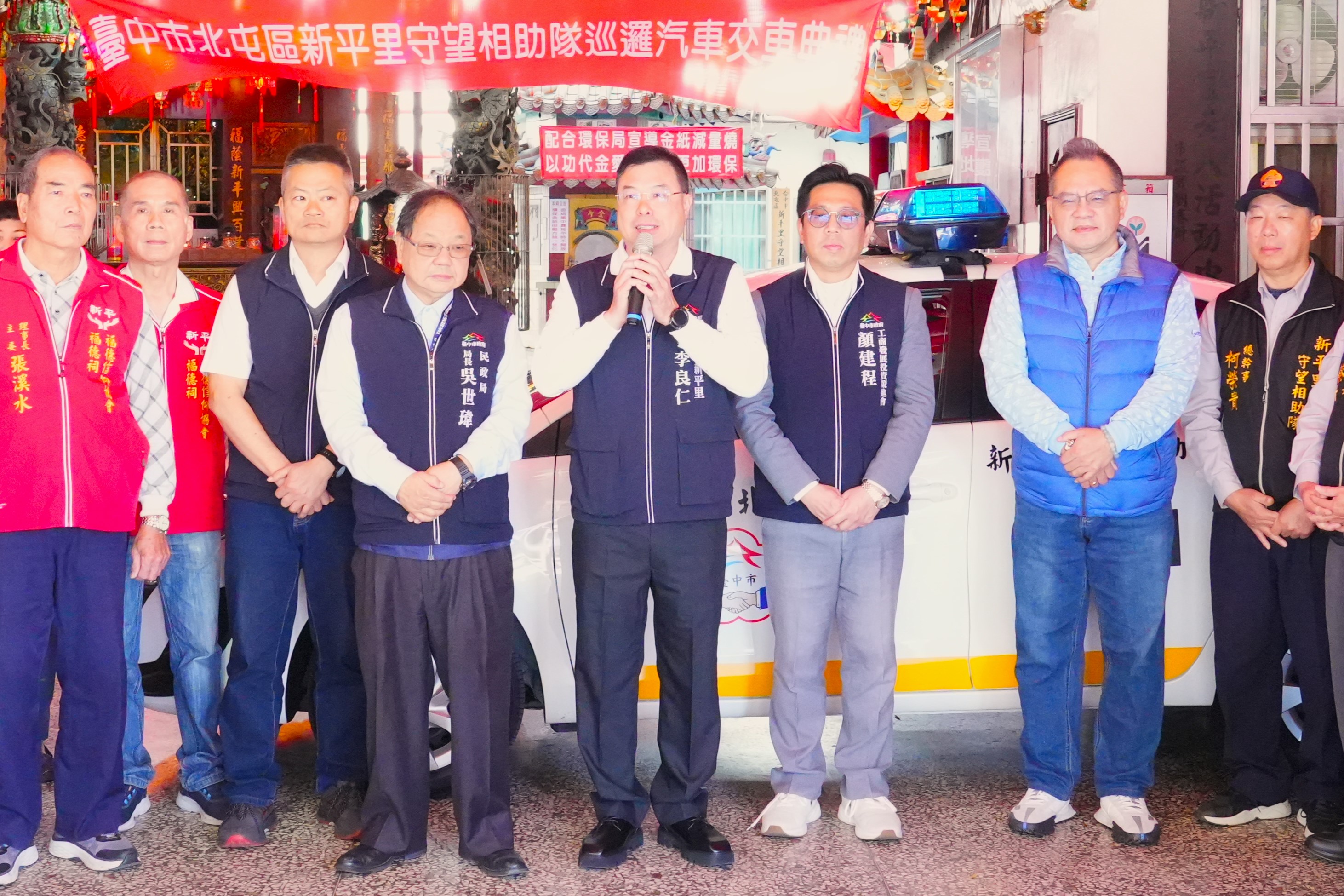 北屯區長陳宗祈表示,新平里守望相助隊共有69名隊員,里內設有15個巡邏點,每位守望隊員都是維持社區治安功不可沒的角色,更是民力與警力合作的典範,感謝市府體恤基層服務需求及地方善心人士合力贊助,協助新平里守望相助隊購置全新巡邏車,讓隊員巡守不怕風吹日曬雨淋,提振隊員巡守士氣,也期盼里隊善用巡邏車持續維護里內治安,與市府攜手編織堅韌有力的社區安全防護網。