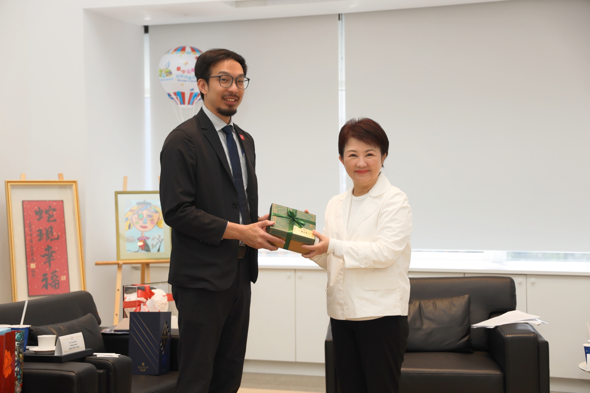 今日拜會,由市長盧秀燕率副市長黃國榮、副秘書長林育鴻、秘書處長謝佳蓁、參議張鎔麒、台中市工商發展投資策進會副總幹事林家興等人,接待英國在台辦事處代表包瓊郁、政治處長文志康及主任陳宥瑋,盧市長除了致贈梨山茶禮盒外,現場還請大家品嚐台中知名的珍珠奶茶。