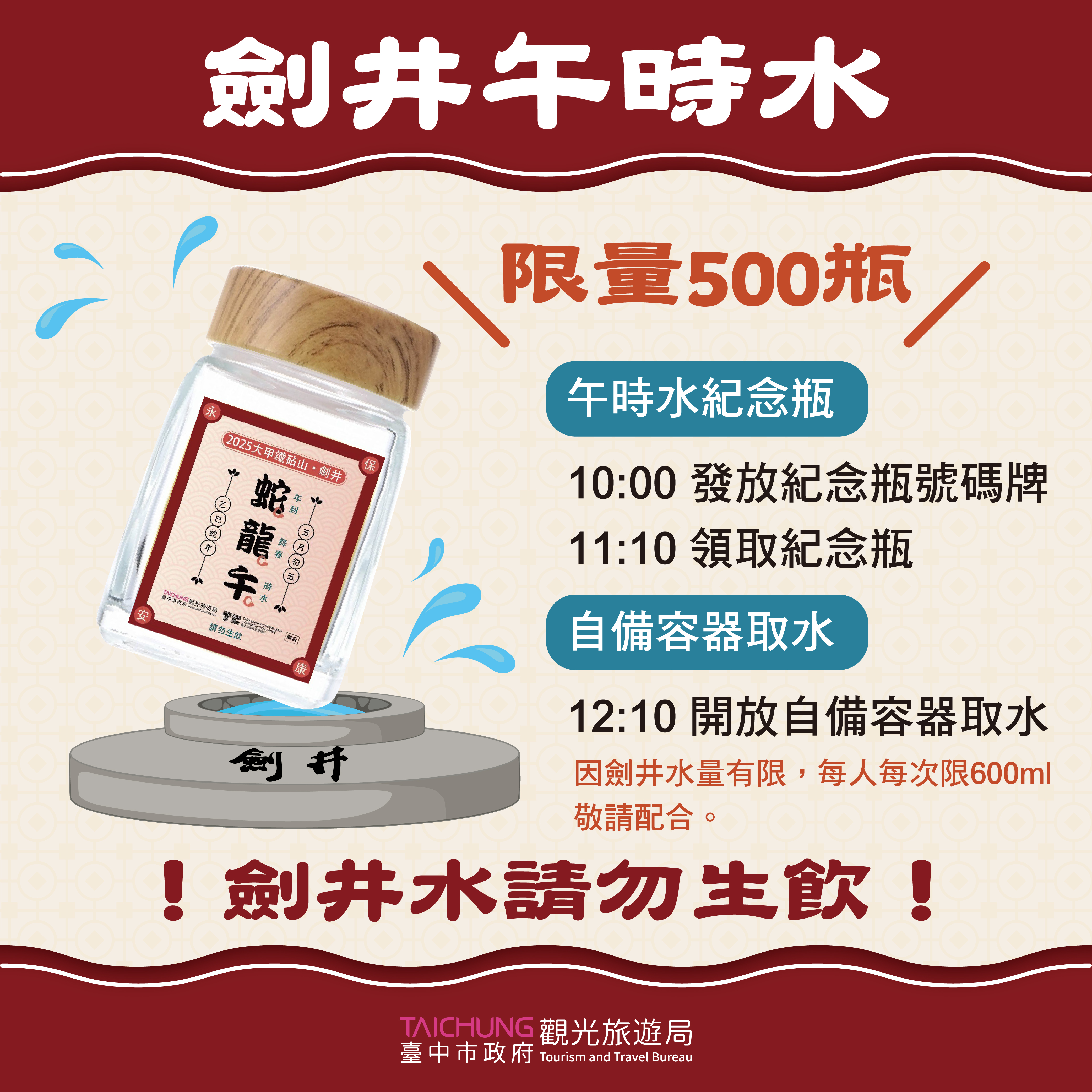 觀旅局長陳美秀表示,在一年中陽氣最旺的端午節,是招好運、去霉運的最佳時刻,因此每年端午節開放劍井取午時水都湧現取水人潮,祈求平安健康、開運除穢;同時也能順遊台中景點、大啖台中美食,體驗悠閒又充實的端午連續假期。