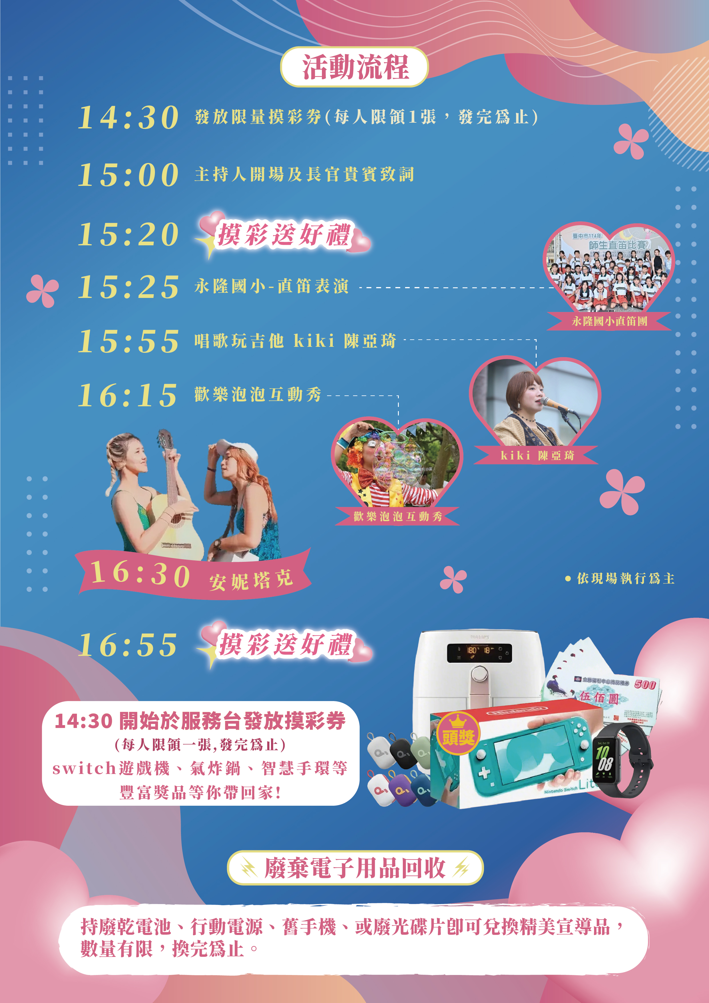 • 活動邀請永隆國小直笛樂團、實力派歌手陳亞琦kiki、安妮塔克、夢幻泡泡秀帶來精彩演出。