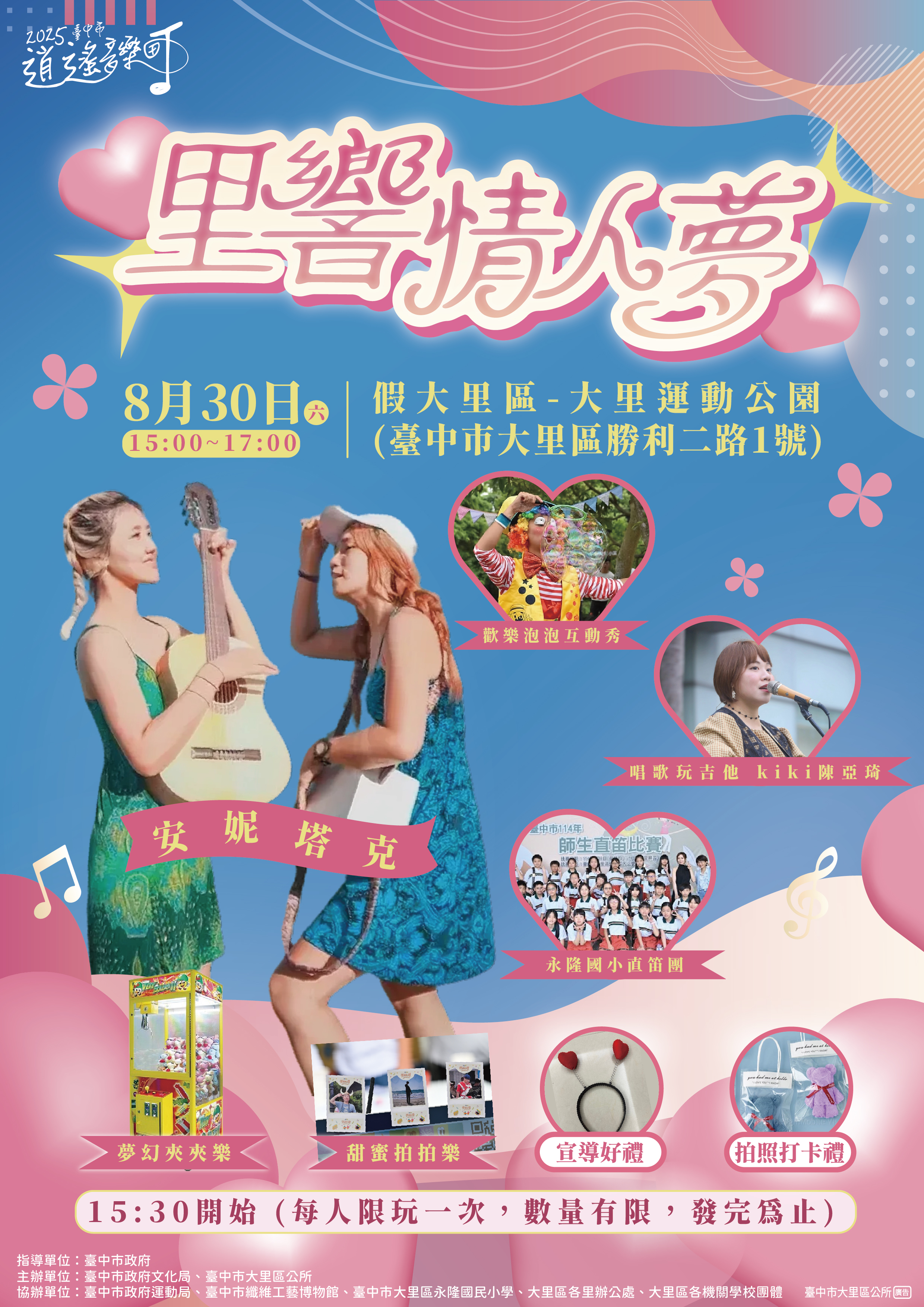 活動名稱 本所於114年8月30日(六)舉辦「2025臺中市逍遙音樂町-里響情人夢」