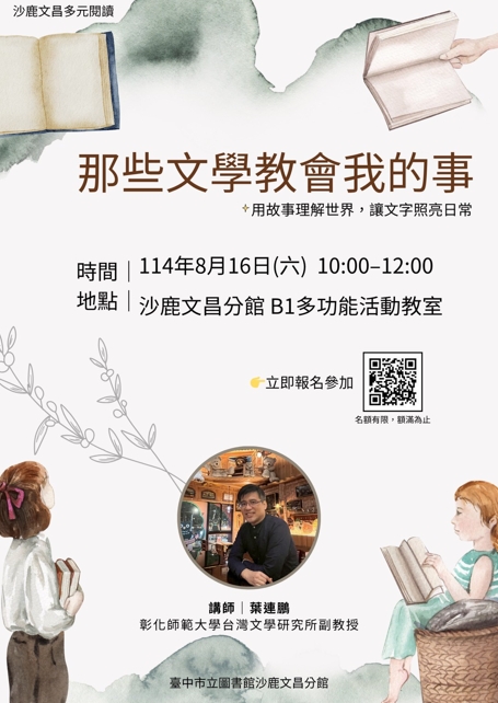 【沙鹿文昌分館】8/16 葉連鵬老師多元閱讀講座 :【 那些文學教會我的事 】