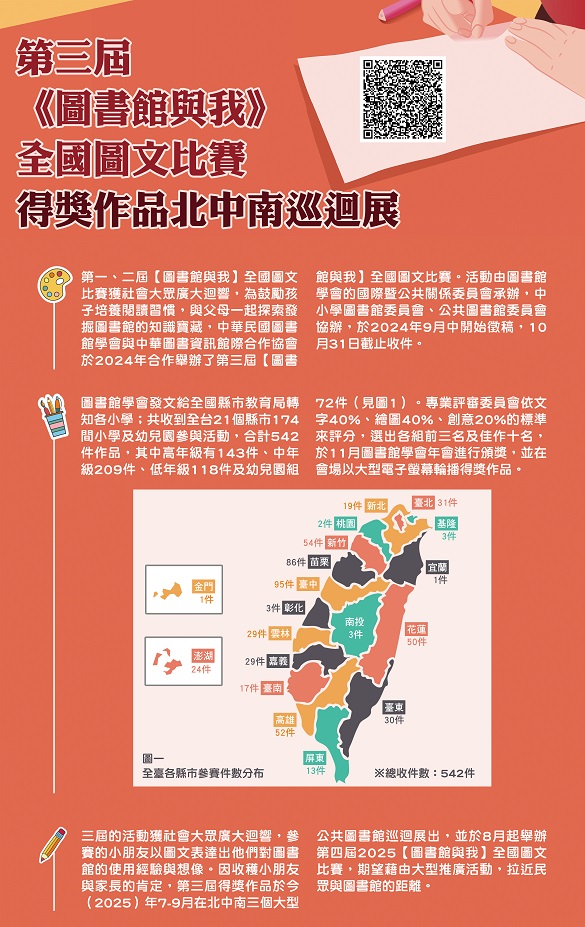 為鼓勵孩子培養閱讀習慣,與父母一起發掘圖書館的知識寶藏,中華民國圖書館學會與中華圖書資訊館際合作協會於今年舉辦「第三屆圖書館與我全國圖文比賽」,讓參賽小朋友以圖文表達出他們對於圖書館的使用經驗與想像。得獎作品將於北、中、南公共圖書館展出,最終站於中市圖展出。
