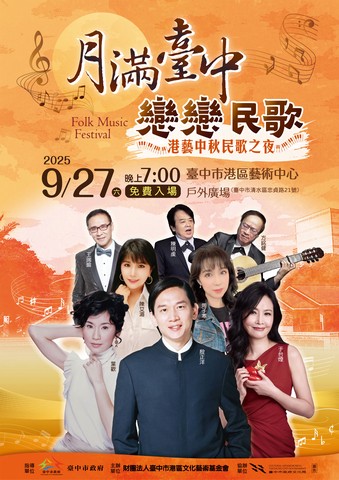 《港藝中秋民歌之夜》已連續辦理8年,儼然成為臺中海線地區民眾每年中秋佳節的一份溫暖約定。今年(114)年9月27日(週六)晚間7點,臺中市港區藝術中心藝術廣場舉辦《月滿臺中.戀戀民歌-2025港藝中秋民歌之夜》音樂會。邀請每年於音樂會中總是會跟大家一年一會的三金歌王殷正洋、金韻獎歌手于台煙、情歌王子王瑞瑜及臺灣經典民歌手葉歡、周子寒、陳艾湄等6位知名歌手及1組聲樂美聲陳明虔及方銘健帶來經典民歌與台語歌曲,期在秋高氣爽充滿濃郁秋風的夜晚,邀請市民朋友一起共享、聆聽一場動人的音樂會。