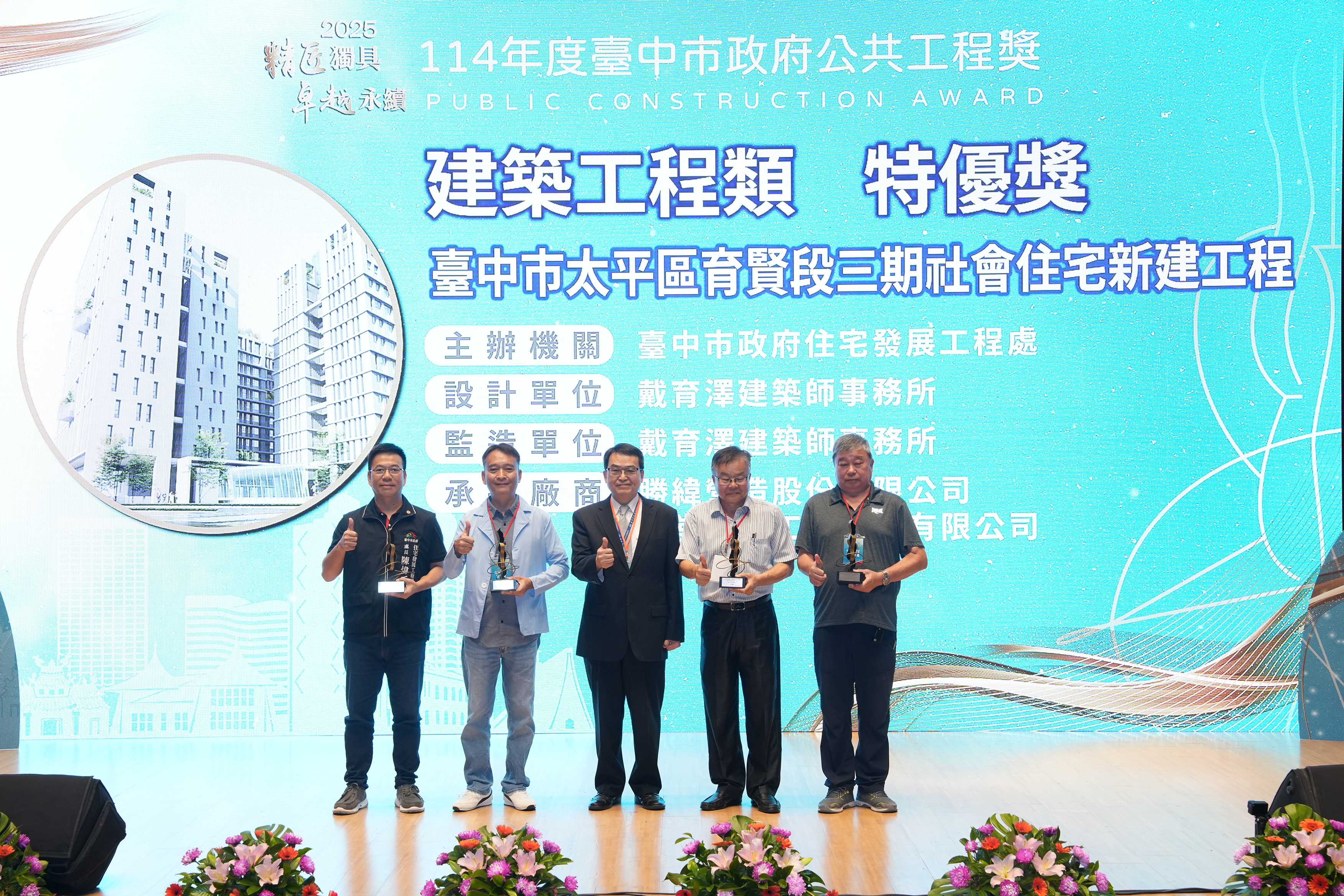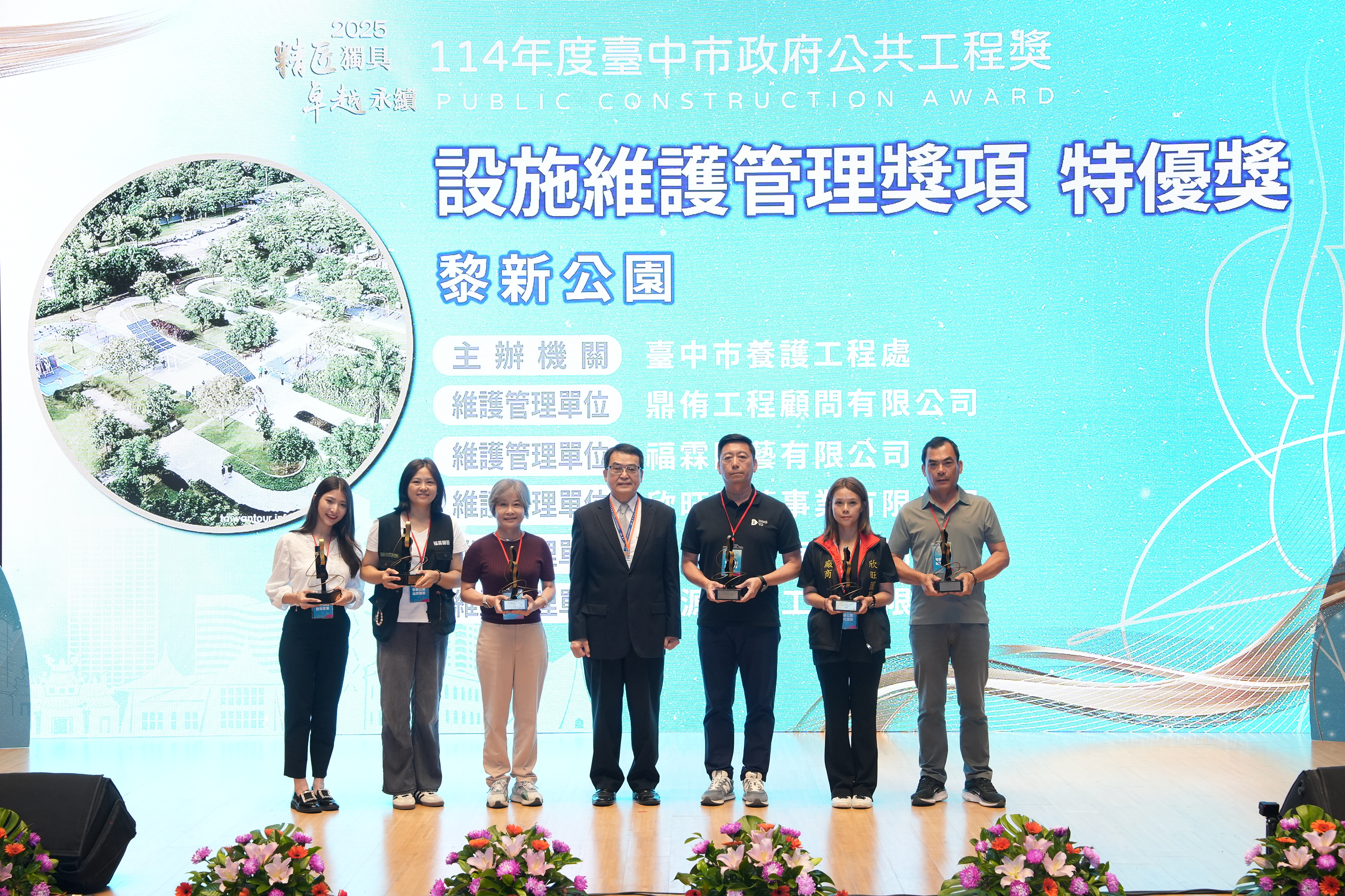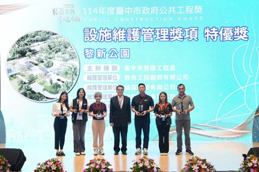 黃秘書長指出,台中市每年都有許多優質的市政建設開工及完工,持續不斷地提升台中市的生活品質及機能性,讓城市成為宜居生活的友善環境空間,此次獲得特優的工程項目共有6件,在交通方面有「東勢區埤豐橋改建工程」及「水湳轉運中心新建工程」、也有社會生活福利的「台中市太平區育賢段三期社會住宅新建工程」、「台中市長青服務中心」及「黎新公園」,更有教育建設「台中市南區樹德國民小學第二期校舍新建工程」。