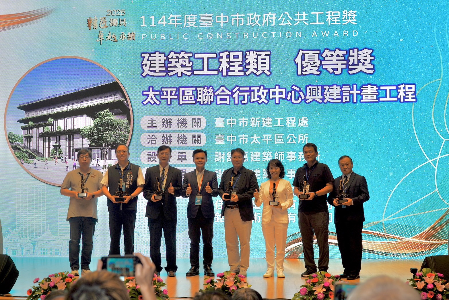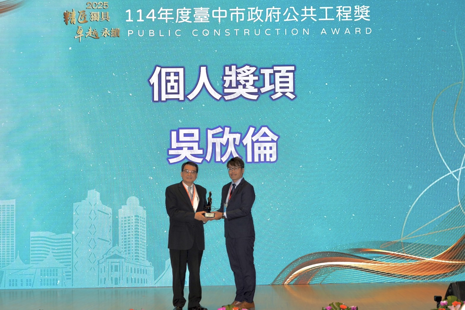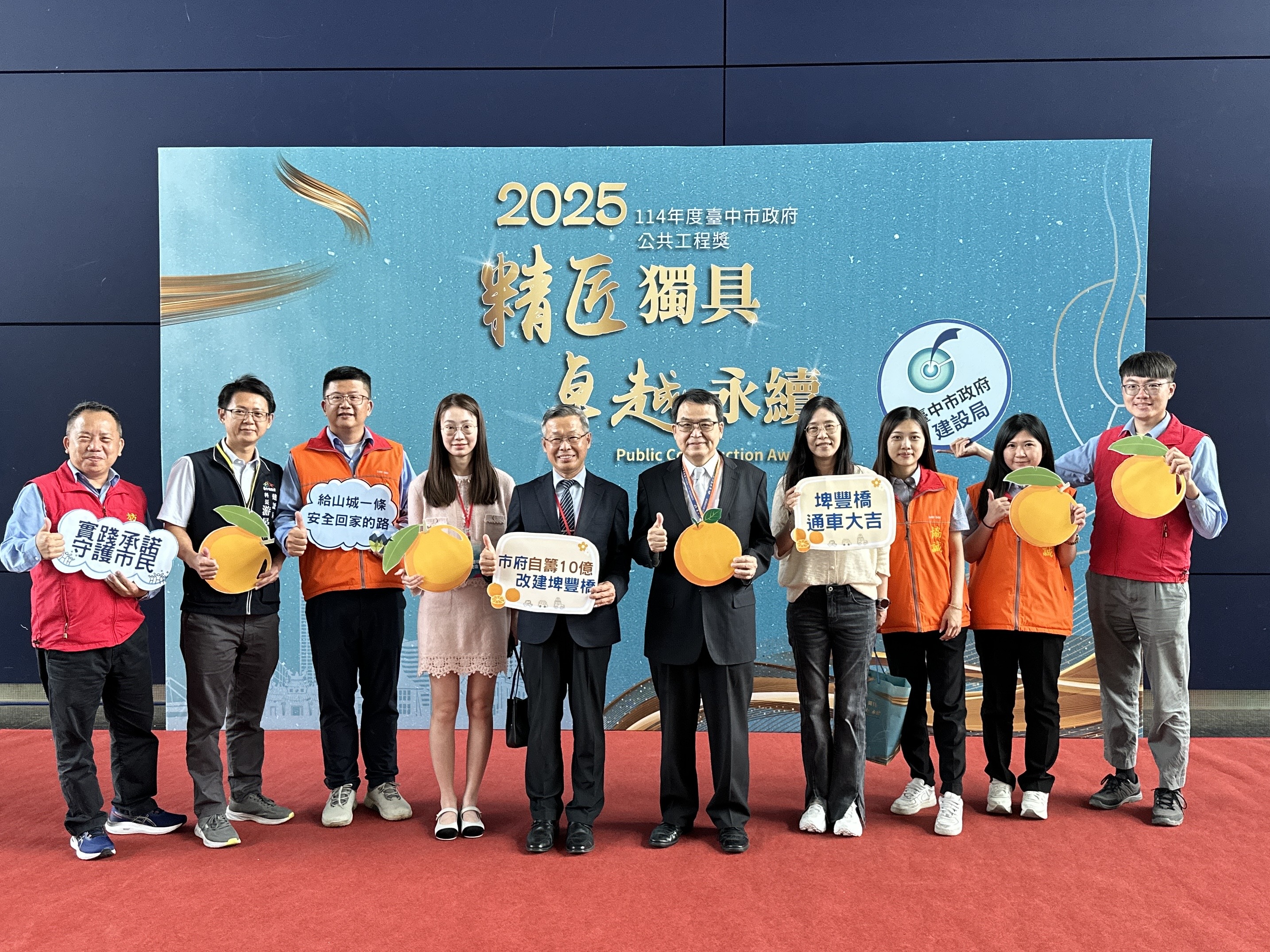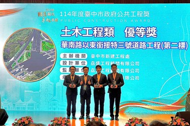 台中市政府今(29)日盛大舉辦「114年第三屆公共工程獎」頒獎典禮,建設局表現搶眼,橫掃土木工程類、建築工程類、設施維護管理類及個人貢獻獎等多項榮譽,共抱回11項大獎,成為全場最大贏家;獲獎工程涵蓋交通建設、公共空間、友善環境等領域,展現市府推動重大建設的卓越實力與多元成果。