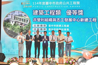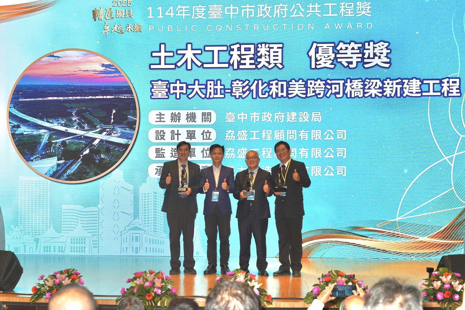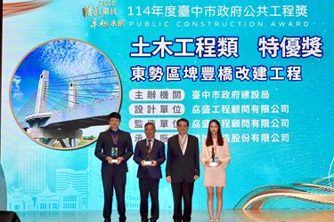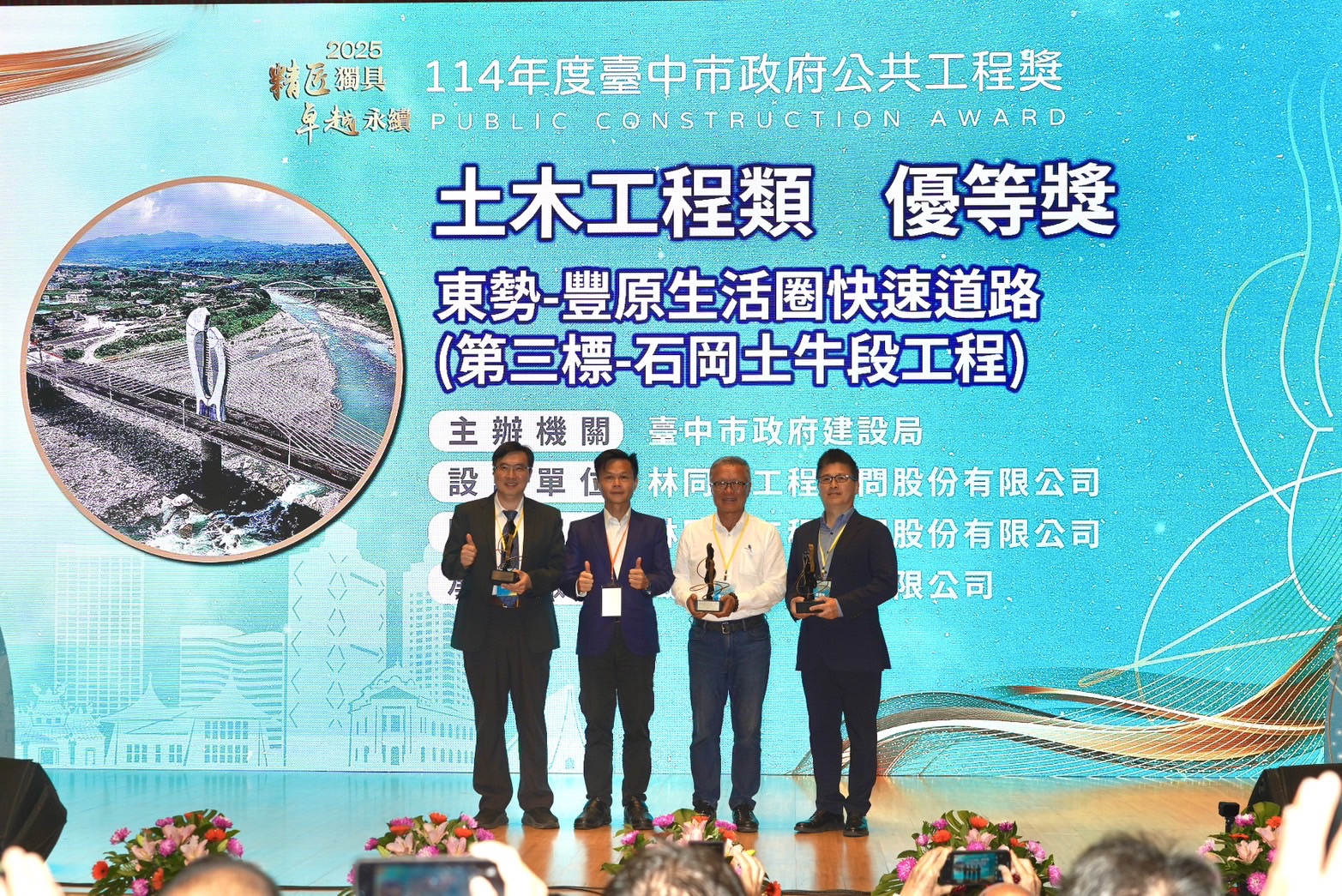 台中市政府今(29)日盛大舉辦「114年第三屆公共工程獎」頒獎典禮,建設局表現搶眼,橫掃土木工程類、建築工程類、設施維護管理類及個人貢獻獎等多項榮譽,共抱回11項大獎,成為全場最大贏家;獲獎工程涵蓋交通建設、公共空間、友善環境等領域,展現市府推動重大建設的卓越實力與多元成果。