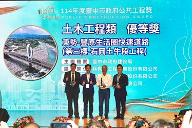 建設局表示,這屆工程類獲獎工程包括:「東勢區埤豐橋改建工程」、「東勢-豐原生活圈快速道路(第三標-石岡土牛段工程)」、「台13線后豐大橋下游側橋面新增引道銜接堤南路新建工程」、「台中大肚-彰化和美跨河橋梁新建工程」、「華南路以東銜接特三號道路工程(第二標)」、「太平區聯合行政中心興建計畫工程」、「台中市北屯國民運動中心統包工程」、「非營利組織與志工發展中心新建工程」。