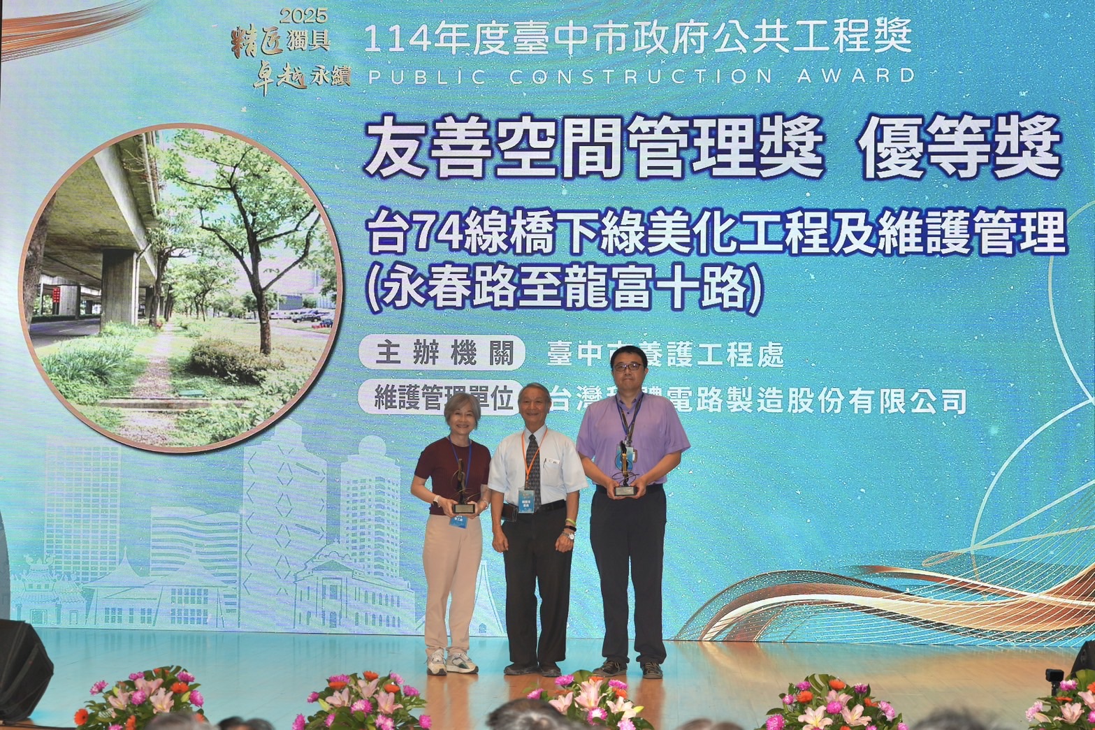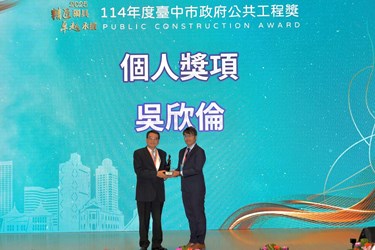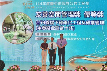 此外,設施維護管理類獎項由「黎新公園」奪得,而此屆新增的「友善空間獎」,則由與台積電合作的「台74線橋下綠美化工程及維護管理(永春路至龍富十路)」榮獲,展現跨界合作促進城市綠化的成功案例。個人貢獻獎部分,繼陳局長於上屆獲獎後,這屆由新建工程處土木工程科長吳欣倫脫穎而出,憑藉專業熱忱與長期對公共建設的投入,深獲評審青睞。