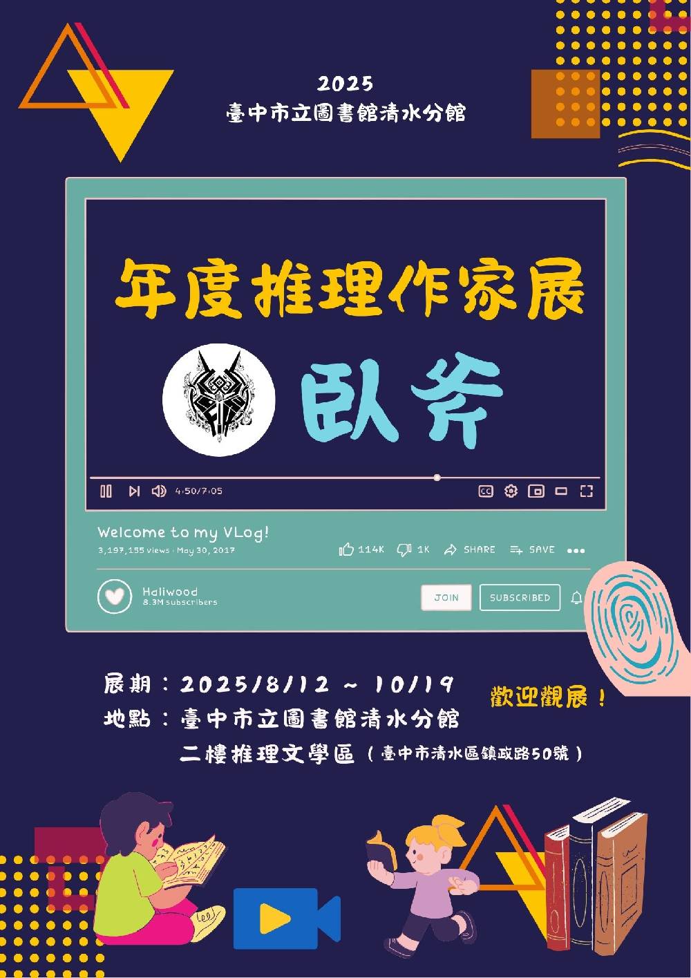展期:114/8/12(二)-10/19(日) 地點:清水分館2樓推理文學區 內容簡介: 透過館藏特色「推理文學」,搭配年度推理作家-臥斧,展出作家相關書目資料等。 開展前暖身推出作家系列活動,如7/5「迷謎知因推理讀書會」,邀請FISH老師帶領讀書會成員討論臥斧《我從前認識的某個人》(鏡文學出版);及8/2「推理文學講堂」,邀請作家臥斧講述—怎麼用「改編」說故事-推理小說中的「改編」,以及我的作品;同時期(8/12-10/19)亦推出「推理成影-書本到影像的懸疑之旅主題書展」,讓讀者不僅是推理入門,而是點線面的循序漸進,認識與作家臥斧及其風格相關的推理文學作品。 |