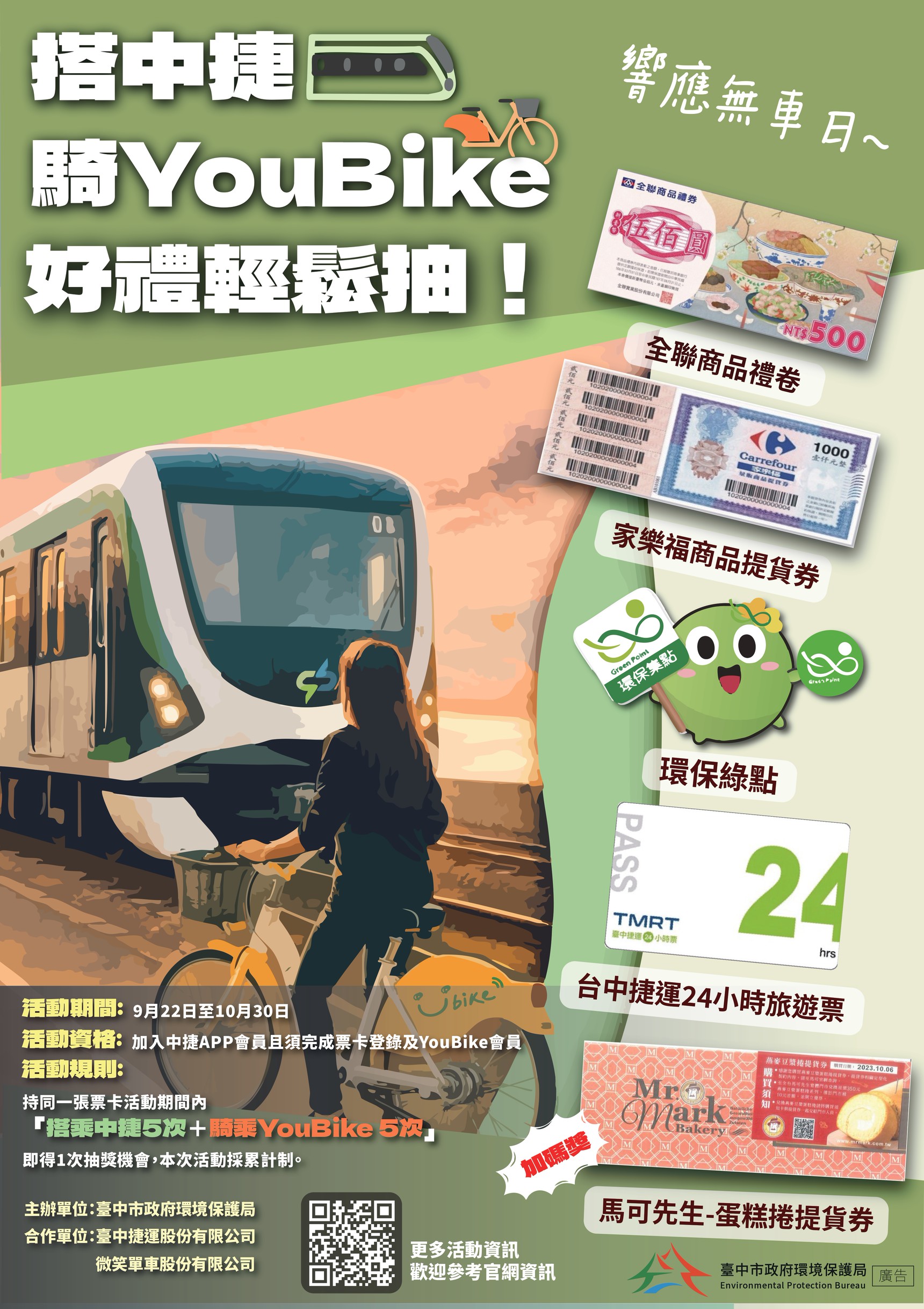 聯合國倡議每年9月22日為「國際無車日」(World Carfree Day),環保局與台中捷運股份有限公司及微笑單車股份有限公司共同響應推動綠色交通宣導活動,自今年9月22日起至10月30日推出「搭中捷、騎YouBike 好禮輕鬆抽」活動,鼓勵市民朋友增加搭乘大眾運輸工具或騎乘自行車通勤,以促進台中低碳永續發展、健康宜居的美好目標。