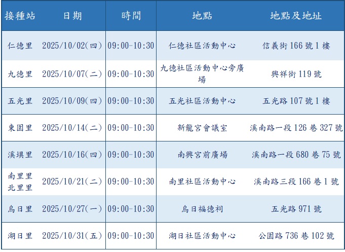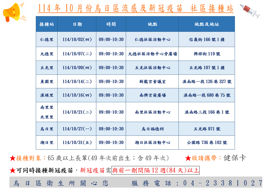 114年10月份烏日區流感及新冠疫苗社區接種站日程表。