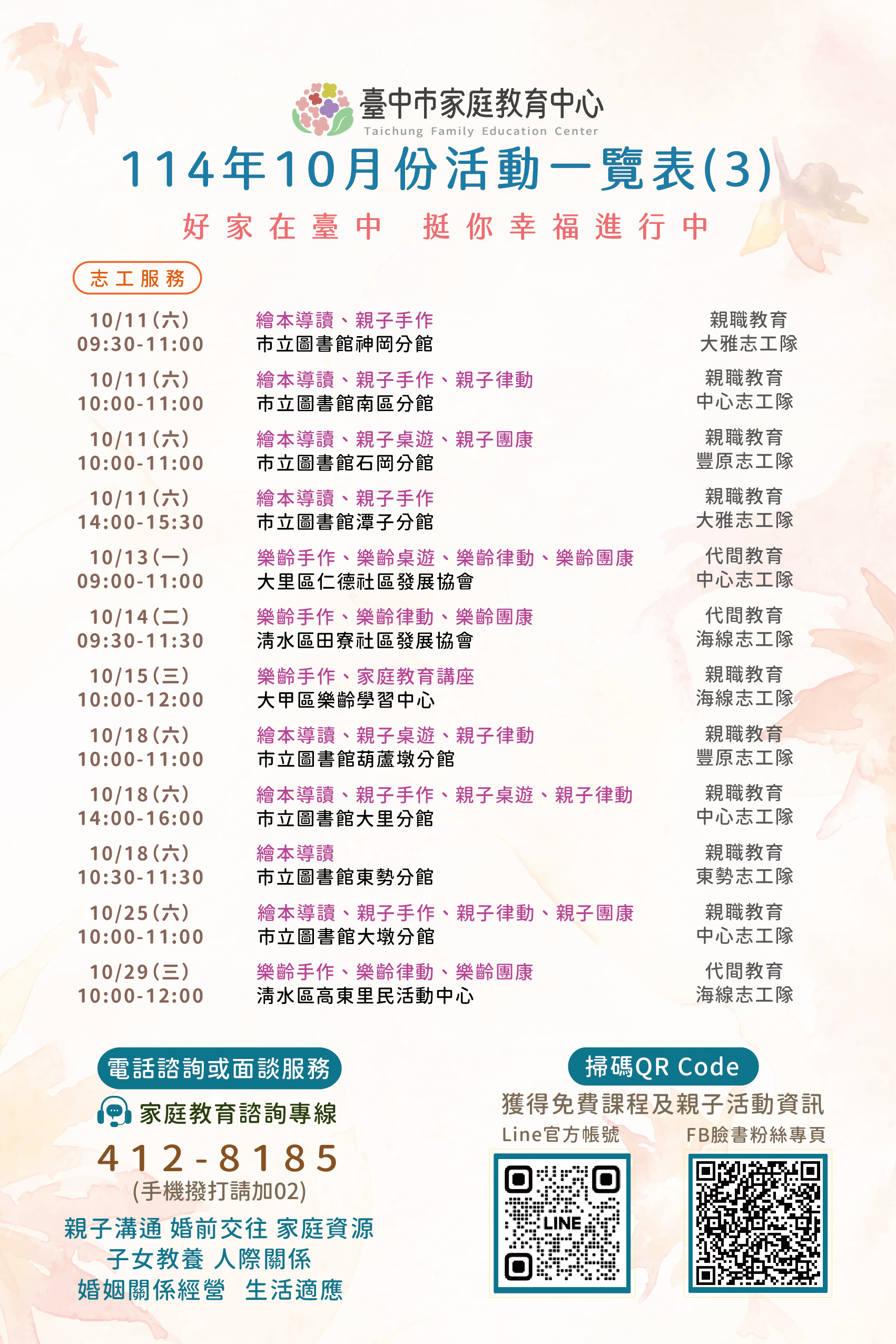 🌱臺中市家庭教育中心邀您一起參與本月精彩多元的課程活動~從親職教育、數位教養、婚姻經營、青少年溝通、情緒管理、幼兒教養到原住民族家庭教育、子職關係探索、婚前交往準備等主題應有盡有,讓我們在溫馨互動的氛圍中學習,累積創造幸福、和諧家庭的力量!