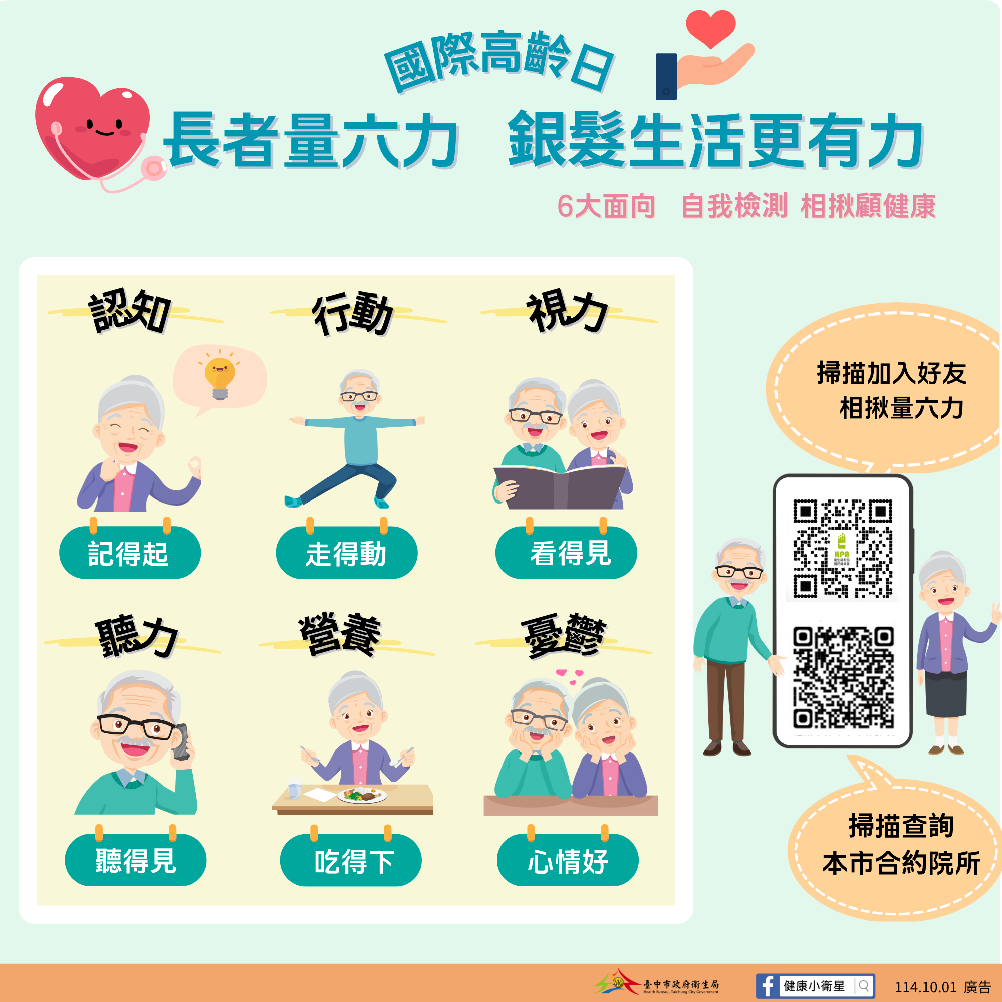每年10月1日是「國際高齡日」,台中市為全台第二大城市,截至114年8月,65歲以上人口已達48萬9,592人,占全市人口17%。台中市政府衛生局與1,114家醫療院所合作推動「成人預防保健服務」,並特別加碼提供「樂齡長青健康檢查」,呼籲市民善用政府提供的各項預防保健服務,及早掌握健康風險,延緩功能退化,維持銀髮生活品質。
