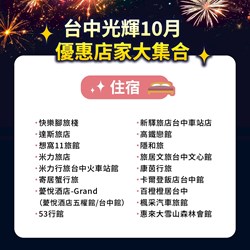 台中市觀旅局長陳美秀表示,為提升國慶連假期間的旅遊體驗,觀旅局積極串聯市內百家觀光業者,提出食、宿、遊、購等各項優惠,住宿方面,從國際級飯店到特色民宿,皆推出專屬住房專案或折扣;伴手禮方面,知名禮品業者如大呷麵本家、微笑天使烘培坊、阿奇師肉乾專賣店、丸文食品觀光工廠等也同步響應,給民眾超值優惠價。