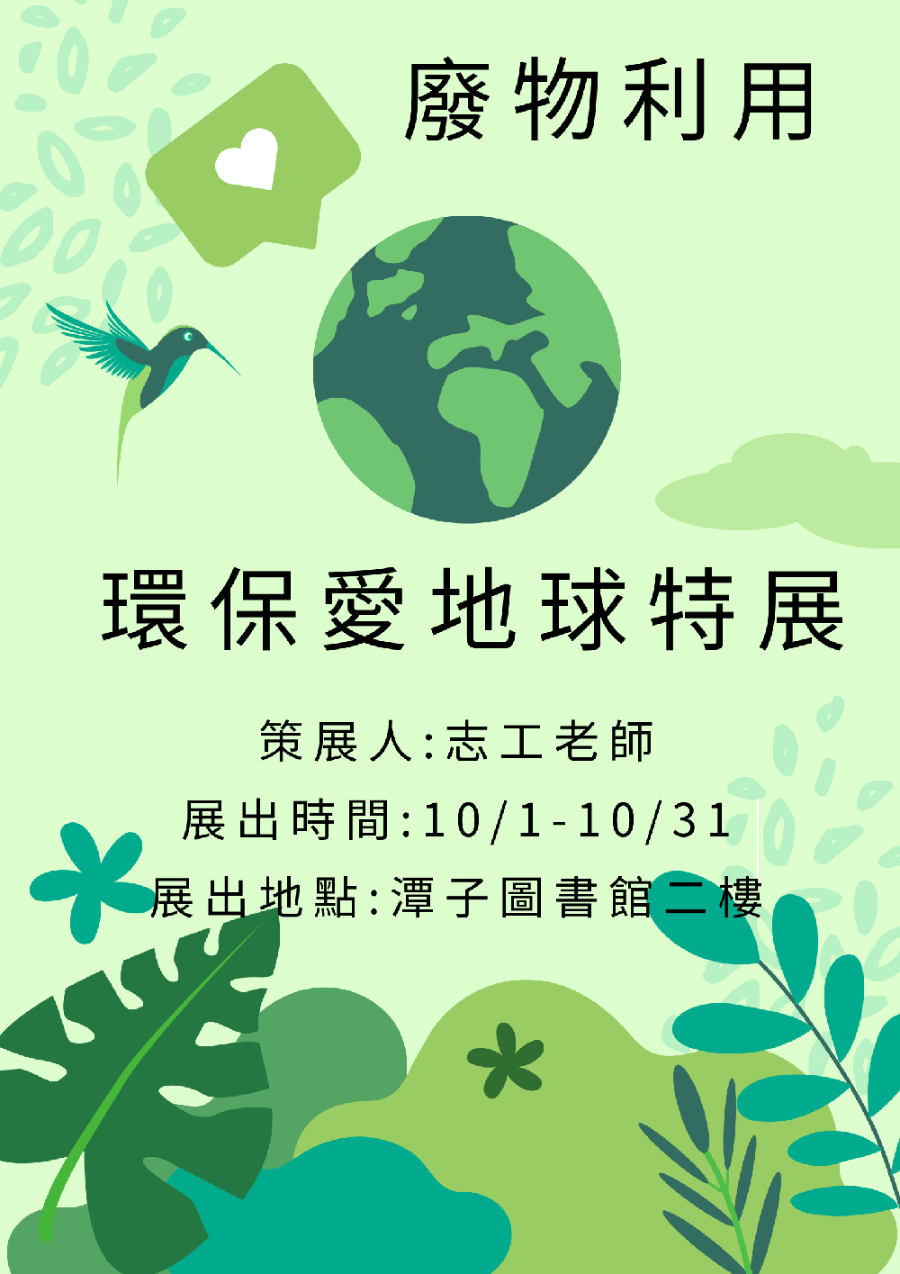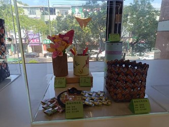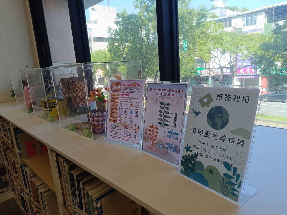 這次的展覽是由圖書館志工老師親自利用生活中隨手可得的東西,延長物命做成實用手作藝品,是小兵立大功,愛護地球最好的表現。 廢棄的雨傘布變成包包,舊的背心變水壺袋,廣告紙編織成置物籃和杯墊….。 也加入宣導環保局有家電診所和寶之林廢棄家具再生中心的簡介。希望大家能更深入了解永續發展的概念。