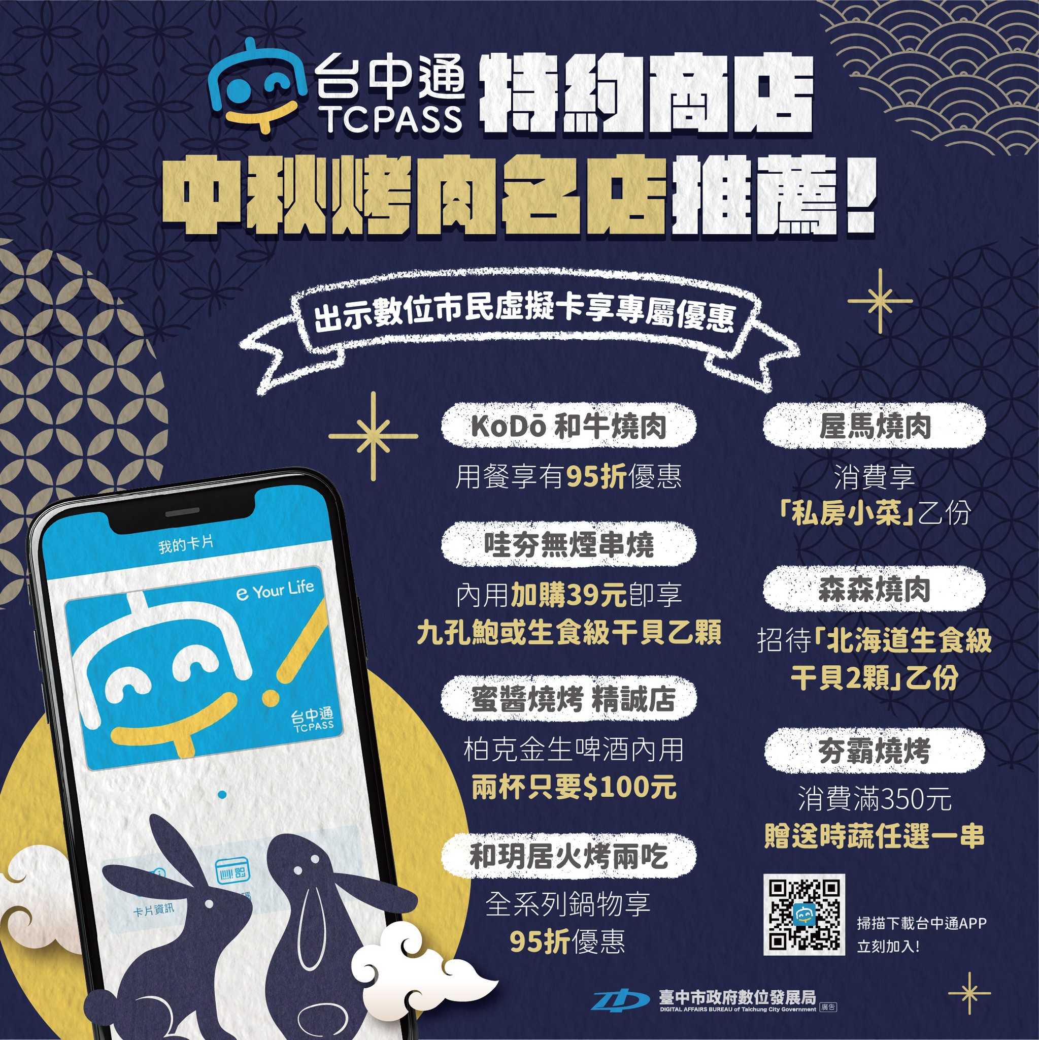 林局長說明,民眾只要到台中通特約店家消費,並出示台中通數位市民虛擬卡,即享有專屬優惠,例如《KoDo 和牛燒肉》用餐享95折;《森森燒肉》招待市價199元的北海道生食級干貝兩顆;《和玥居火烤兩吃》全系列鍋物同樣享有95折;《蜜醬燒烤-精誠店》推出柏克金生啤酒兩杯只要100元的超値方案;《哇夯無煙串燒》可用39元超值價加購九孔鮑或生食級干貝乙顆;《屋馬燒肉》贈「私房小菜」乙份;《夯霸燒烤》消費滿350元即可招待時蔬任選一串。多樣化的專屬美味,用《台中通》盡情感受中秋佳節的溫馨氣氛,共度團聚時光。