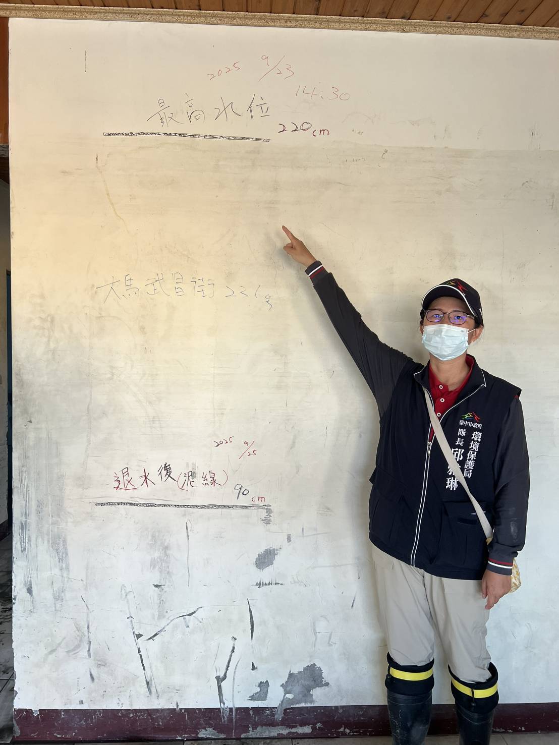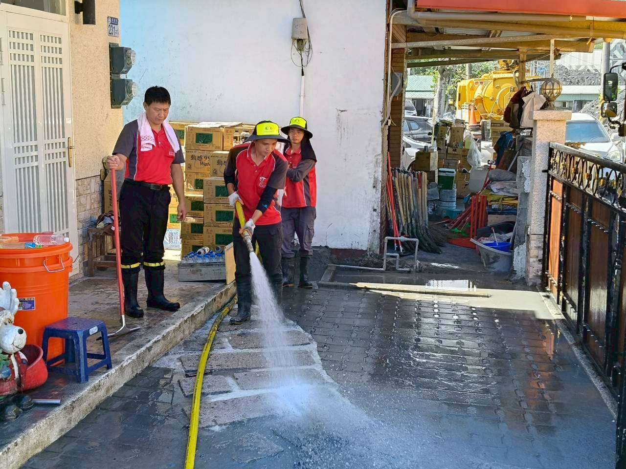 環保局大隊長邱雅琳表示,日前清理民宅獲得居民好評,吸引鄰近居民前來預約支援。團隊兩日已完成 9 戶民宅及 1 間農機行清理。面對牆面高達一層樓的淹水痕跡及厚重污泥,環保局調派清溝車與灑水車強力沖洗,再由同仁化身「刷子超人」、「刮水超人」合力清潔,總計完成約 5,200 平方公尺清理,協助居民家園逐漸恢復整潔。