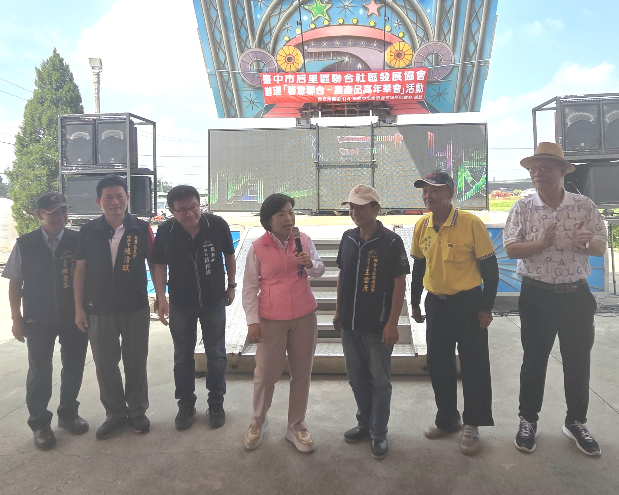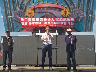 今日活動,立法委員楊瓊瓔、市議員邱愛珊、陳本添、台中市政府農業局科長黃育珍、后里區長賴同一、后里農會總幹事陳清琪、民政顧問吳建泰、后里國中校長賴勝豐、月眉國小校長邱弘毅、聯合社區發展協會理事長王雲彥、神岡區新庄社區發展協會理事長藍秀惠、聯合里里長陳查某、后里三皇宮主任委員林隆圳、市議員陳清龍、張瀞分也分別派代表共襄盛舉。(10/04*15)*農業局