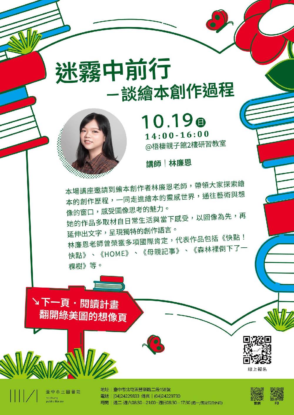 講師:林廉恩 時間:10/19(日)14:00-16:00 地點:梧棲親子館2樓研習教室(臺中市梧棲區民生街15-77號)