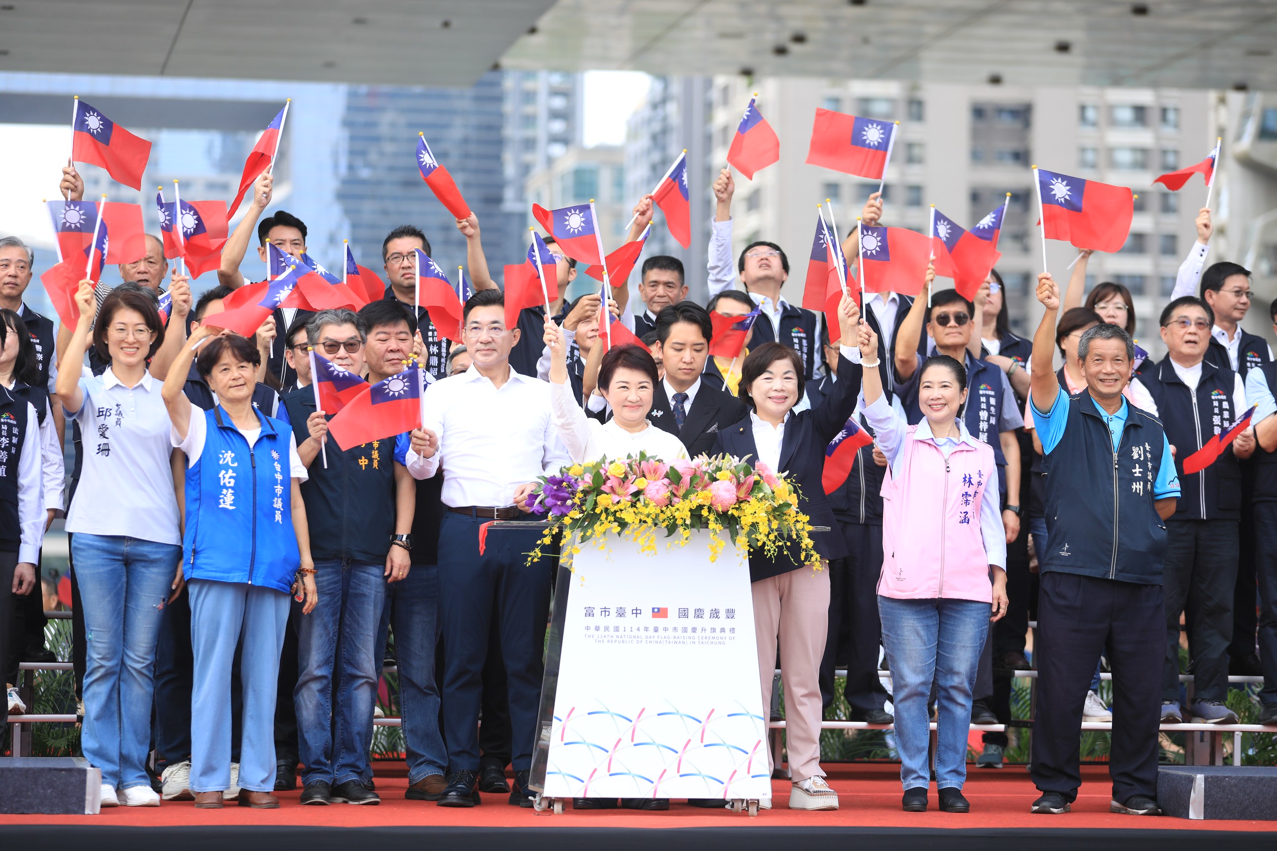 台中市政府114年雙十國慶升旗典禮,今(10)日在府前廣場盛大舉行,76位民防義警及霹靂小組聯手展護全國最大長36公尺、寬24公尺的巨幅國旗進場,場面吸睛壯觀,全場突破2萬3千人次參加刷新紀錄。市長盧秀燕致詞表示,7年前她上任時,台中在文化、經濟、醫療與公共設施各方面皆存在明顯不足,市府團隊在財政吃緊的情況下,仍展現魄力與決心,全力推動重大建設,今年是歡欣豐收的一年,眾多建設將陸續啟用,展現具體成果。