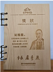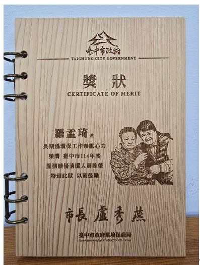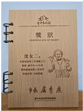 陳局長指出,今年為推廣資源回收永續環保理念,致贈傑出績優隊員採用環保局寶之林所製作檜木筆記本獎狀,獎狀素材取自清潔隊回收的老檜木廢棄家具,封面採以富有紀念性的隊員個人生活照雷刻設計,保有檜木天然香氣與溫潤質感,同時融合傳統工藝與現代設計,兼具文化底蘊與環保精神,也能展現資源循環再利用的永續價值。