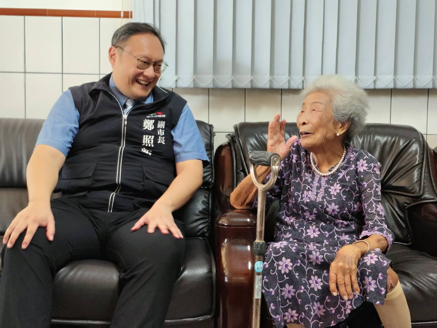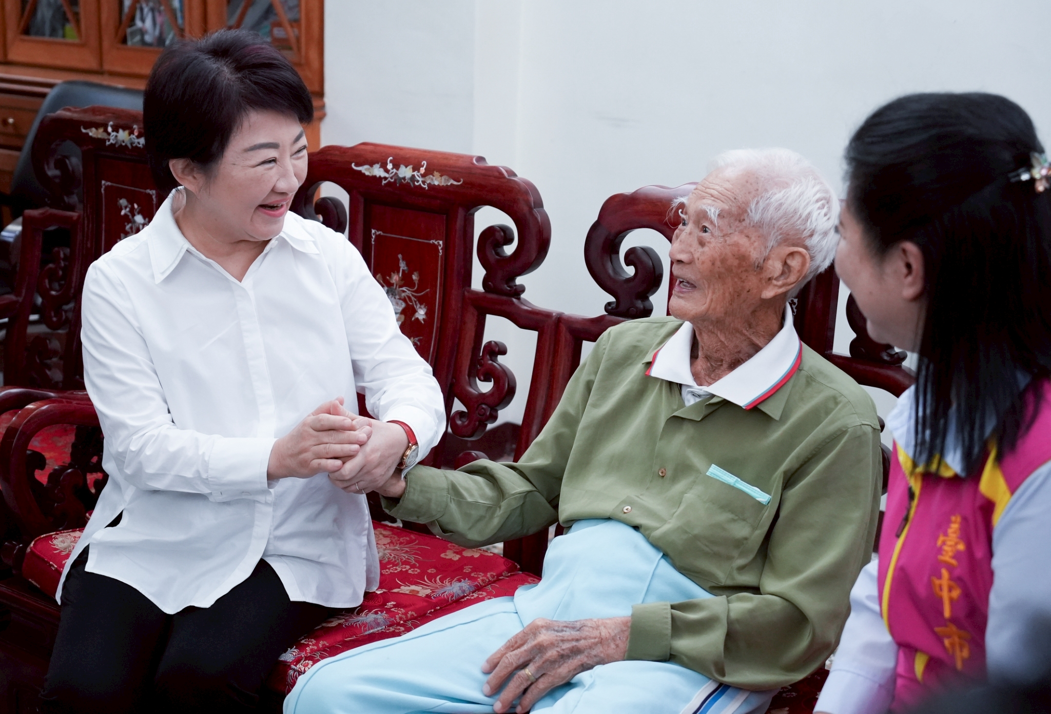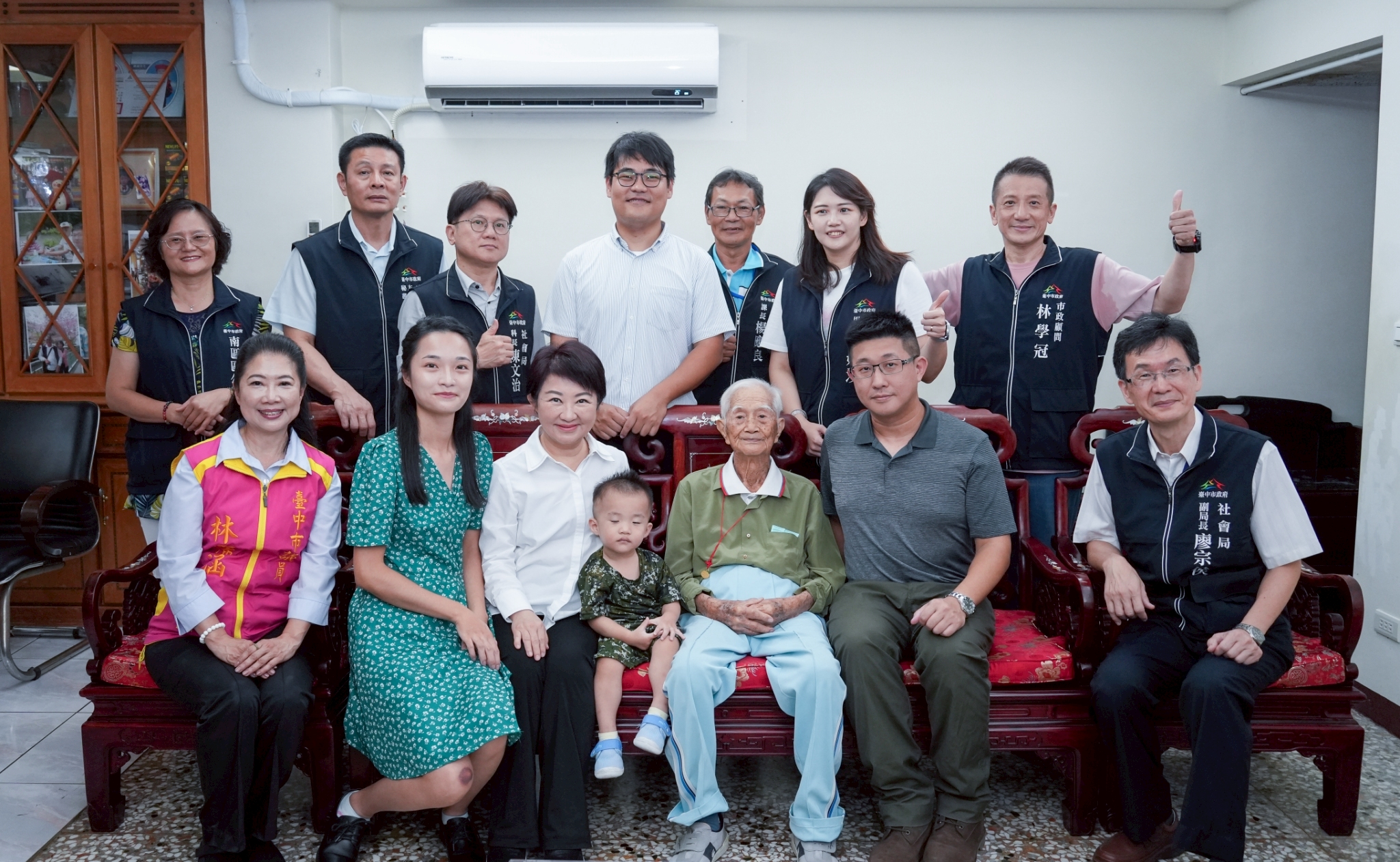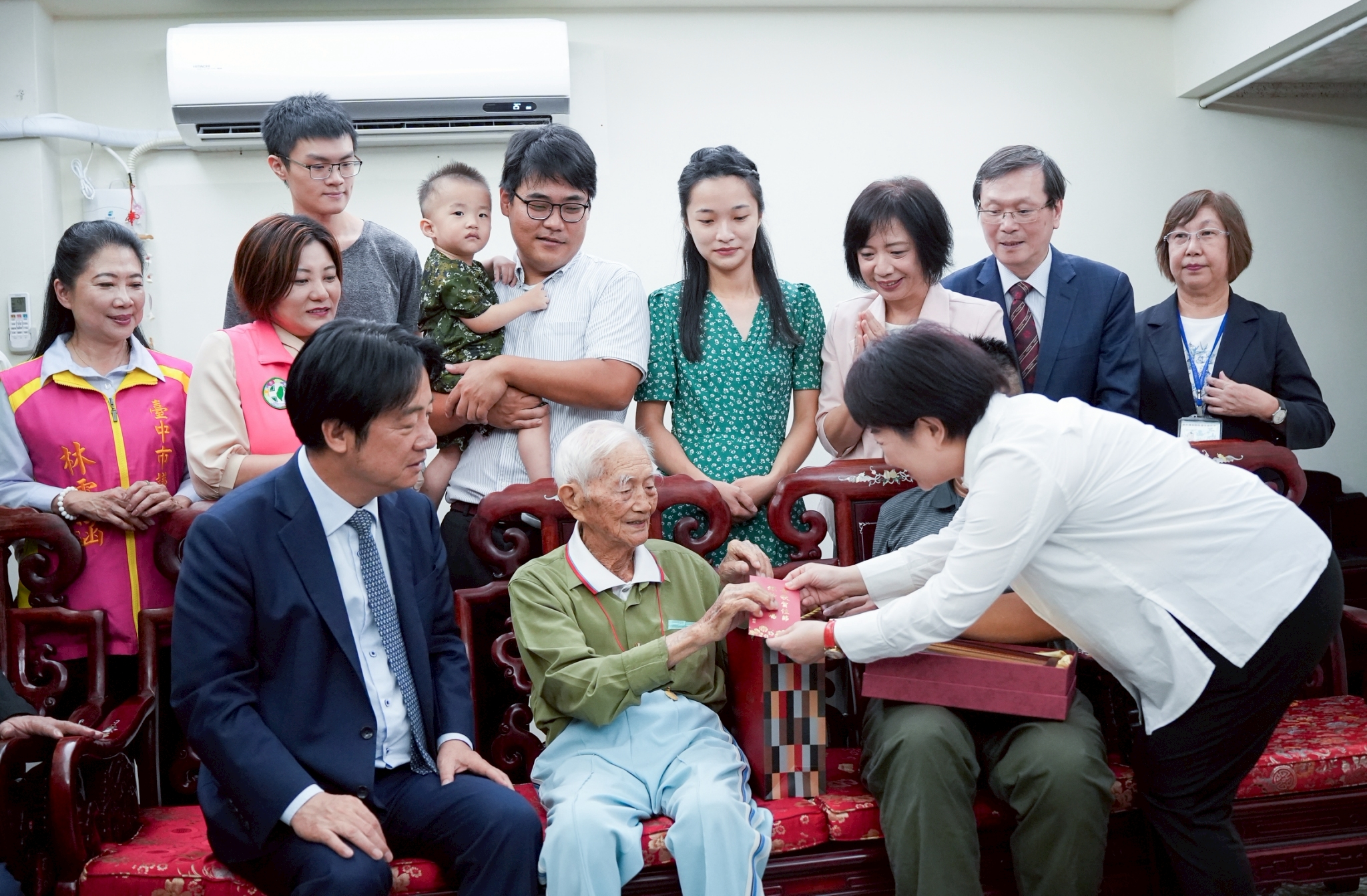 總統賴清德今(14)日在台中市長盧秀燕及副市長鄭照新陪同下,拜訪陳活森阿公及洪李英嬌阿嬤兩位百歲人瑞,致贈總統府及衛生福利部聯名的金鎖片。盧市長感謝賴總統關心台中的長輩,也送上市府重陽敬老禮金1萬元及科技涼被,誇讚長輩元氣十足,家族和樂融融,並祝福長輩身體健康。