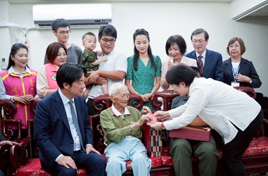 另一位人瑞洪李英嬌阿嬤表示,看到眾人來訪她非常開心,自己平時吃早齋,作息規律不挑食,記憶力很好,不但記得兒孫輩的名字,還會點名。四代同堂將近90人的大家族感情融洽、和睦團結,年紀最小9個月的曾外孫女,今天也一同慶賀佳節。