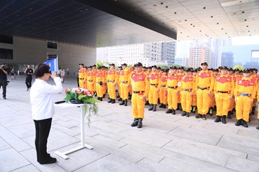 盧市長表示,台中市政府消防局特種搜救隊是「台灣的英雄、台中的驕傲」,在花蓮光復鄉救災中展現專業、愛心與堅毅精神。她強調,授旗儀式象徵的不僅是榮譽,更是責任與使命。她感謝隊員無私奉獻,並親自授旗致敬。她指出,台中搜救隊不僅在國內多次救災,亦具土耳其國際救援經驗,能力全國數一數二。此次出發參與國際重型認證,包含104名成員、醫師、技師與搜救犬,期勉順利通過認證,持續守護市民安全。