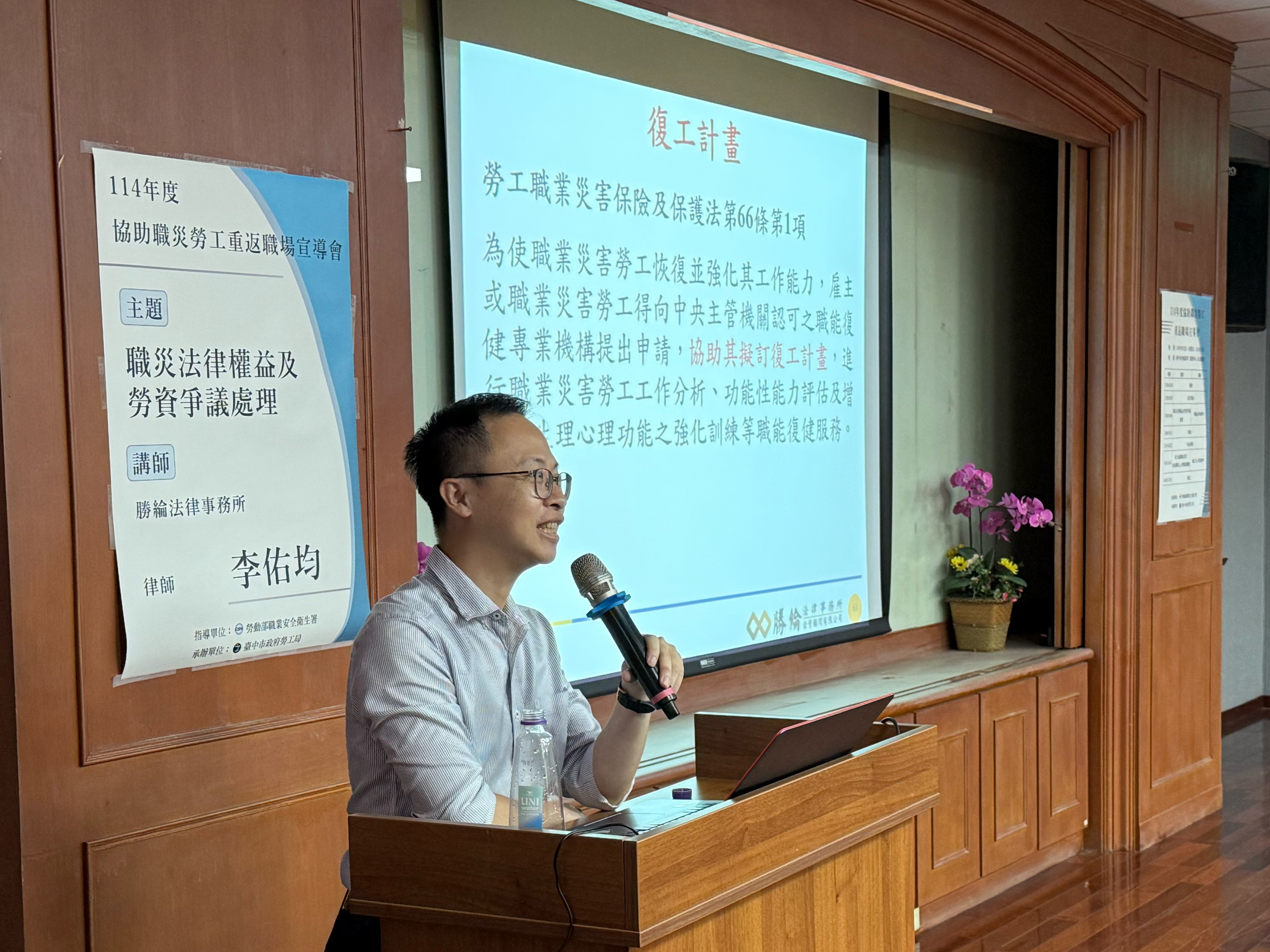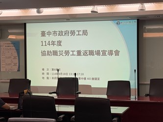 為協助職業災害勞工順利重返職場,台中市政府勞工局藉由舉辦6場次「協助職災勞工重返職場宣導會」,說明協助職災勞工重返職場補助辦法、職災保險給付、職災職能復健、職災法律權益、心理健康關懷及職務再設計等面向的法令、資源及案例分享,共吸引逾350人參加。