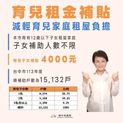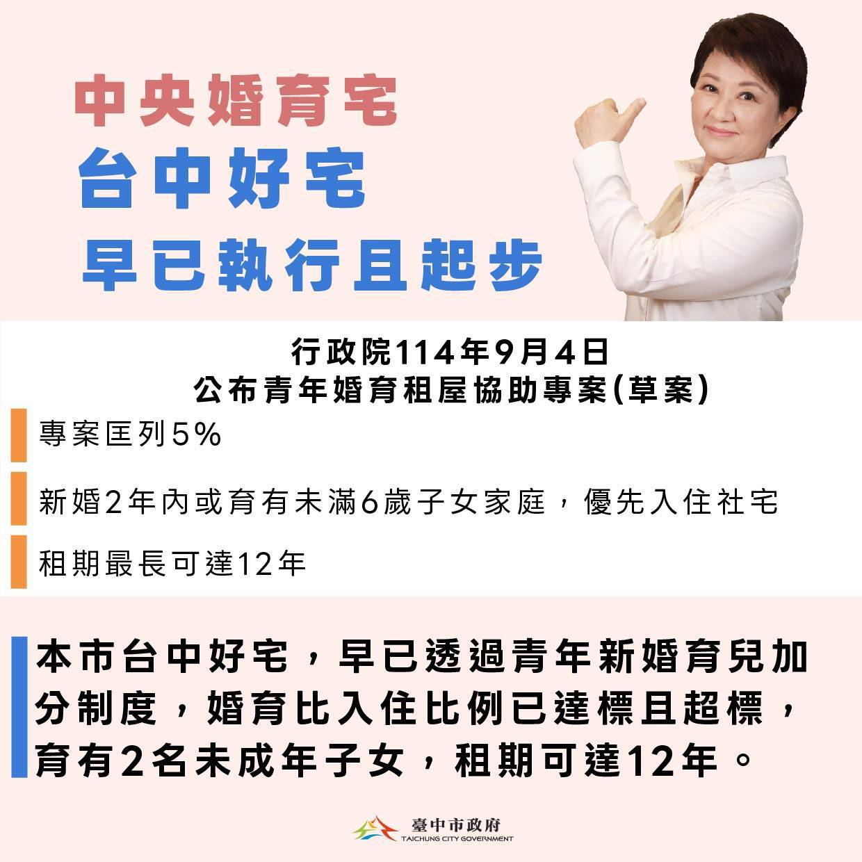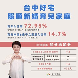 針對報載中央住都中心在年底釋出 1,022 戶婚育宅中,六都獨缺台中市一事,台中市政府都發局表示,台中市府社會住宅針對育兒友善家庭的加分機制,已率先上路多年,台中好宅目前「婚育家庭」高達14.7%。
