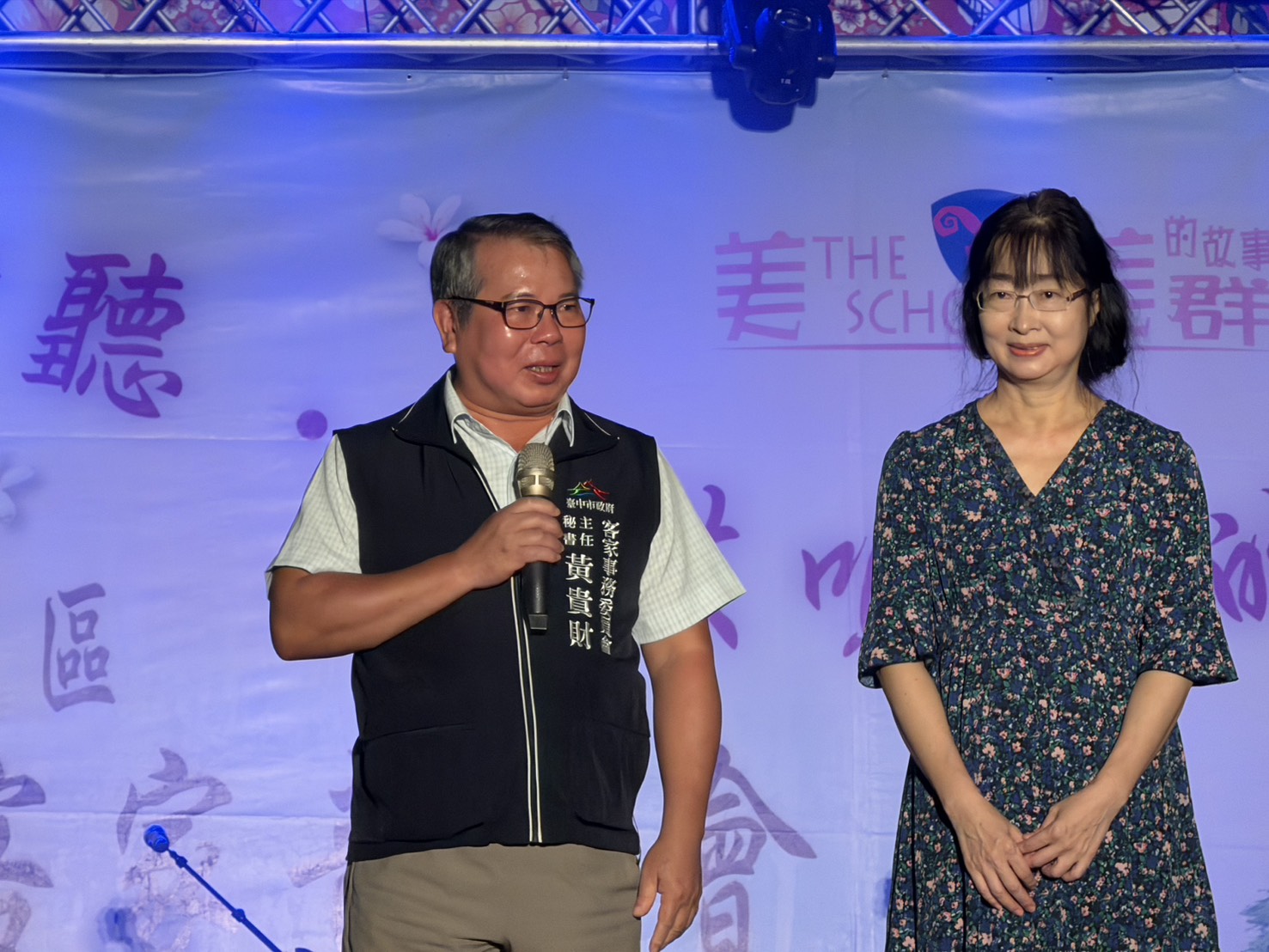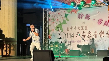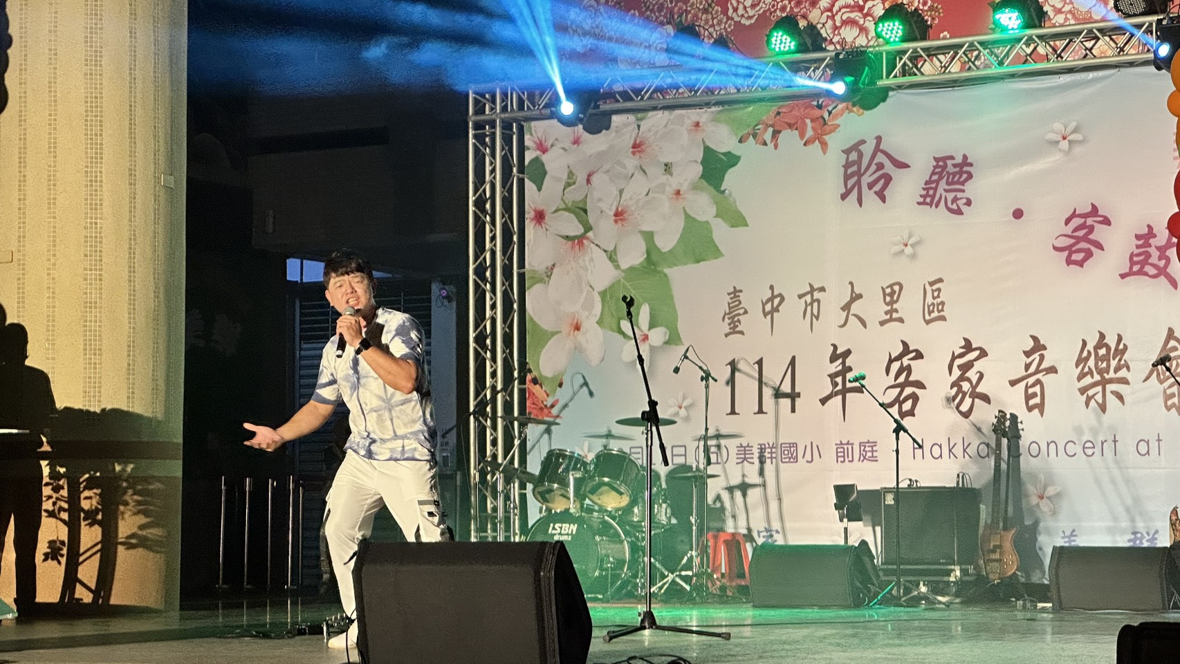 台中市政府客家事務委員會與大里區公所共同舉辦「114年客家音樂會~聆聽‧客鼓鳴心的旋律」活動,於昨(17)日晚間在美群國小前庭舉辦,以多樣的音樂歌唱、舞蹈等表演形式,生動詮釋客家文化的深厚底蘊與多元風貌,吸引許多年輕朋友到場一同享受秋風颯爽的周末夜晚。