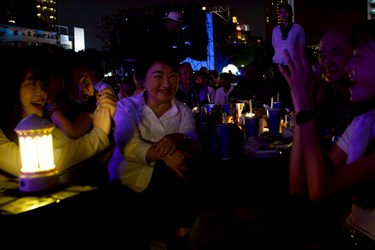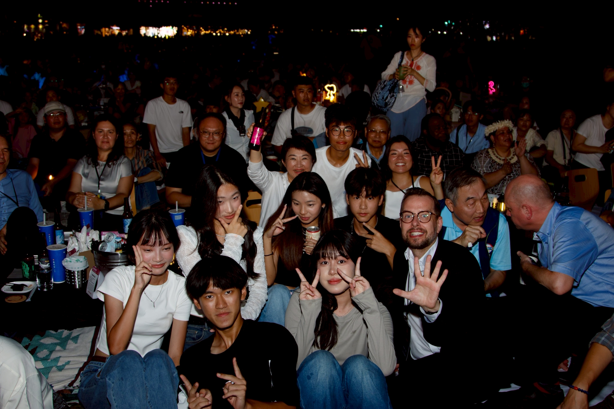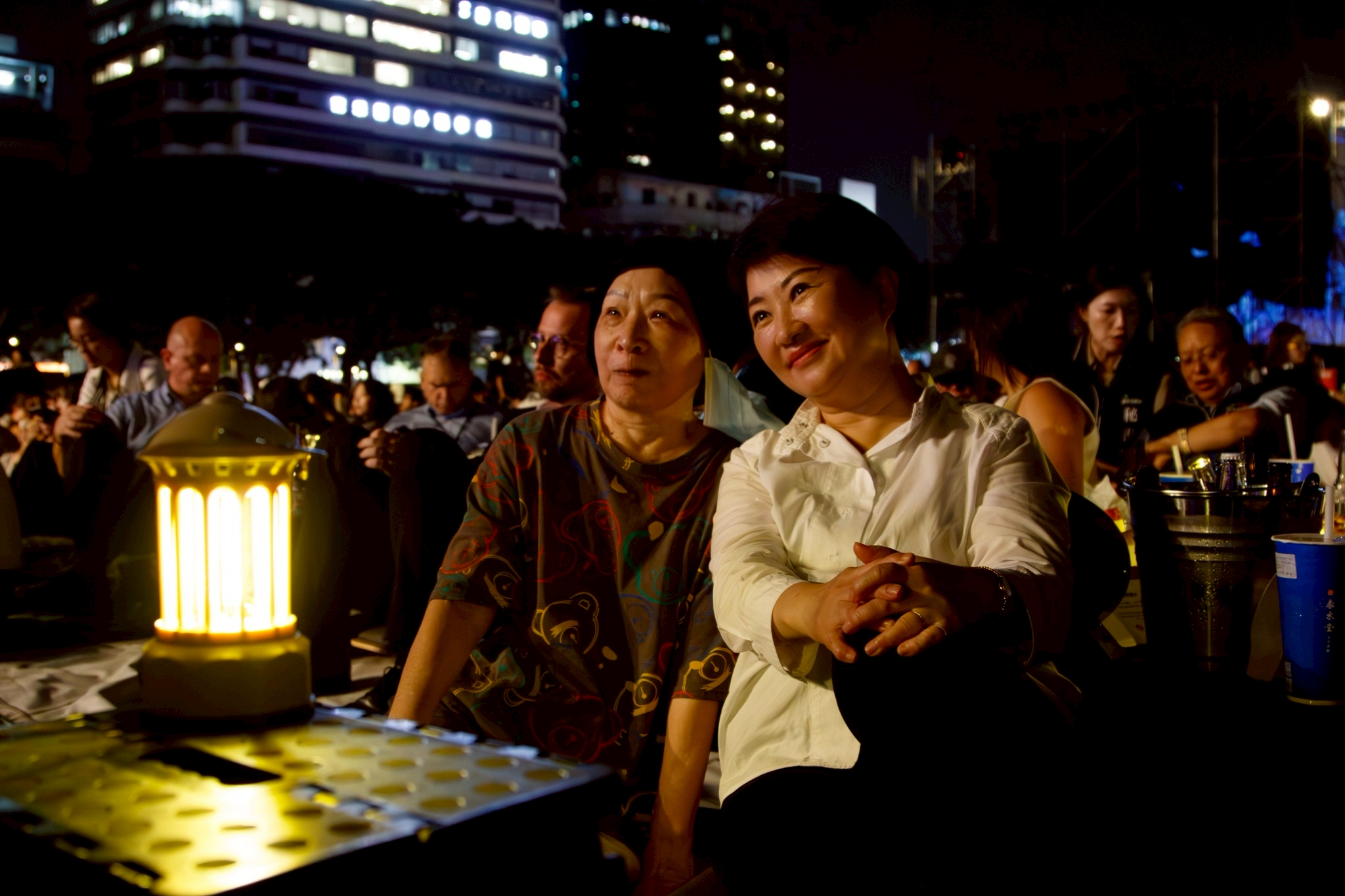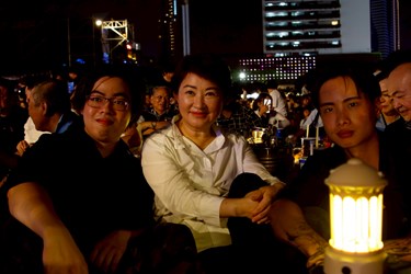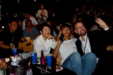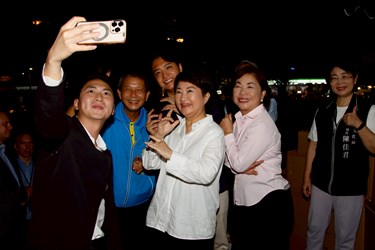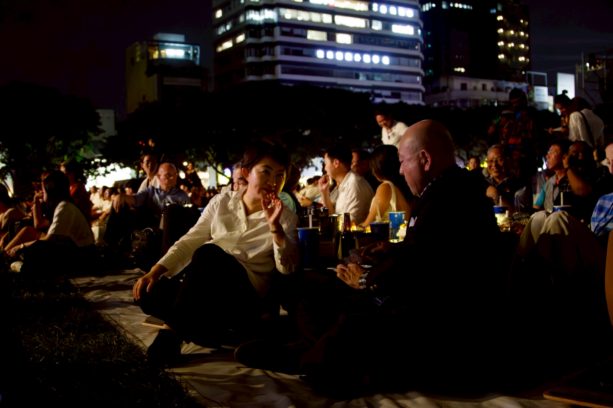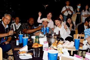 盧市長簡短40秒旋風式致詞,隨即鋪上野餐墊席地而坐,與貴賓一同享受台中美食,並和現場民眾熱情互動,一同享受爵士樂。「Enjoy it!」盧市長說,歡迎來台中爵士音樂節,一起共享美好夜晚。