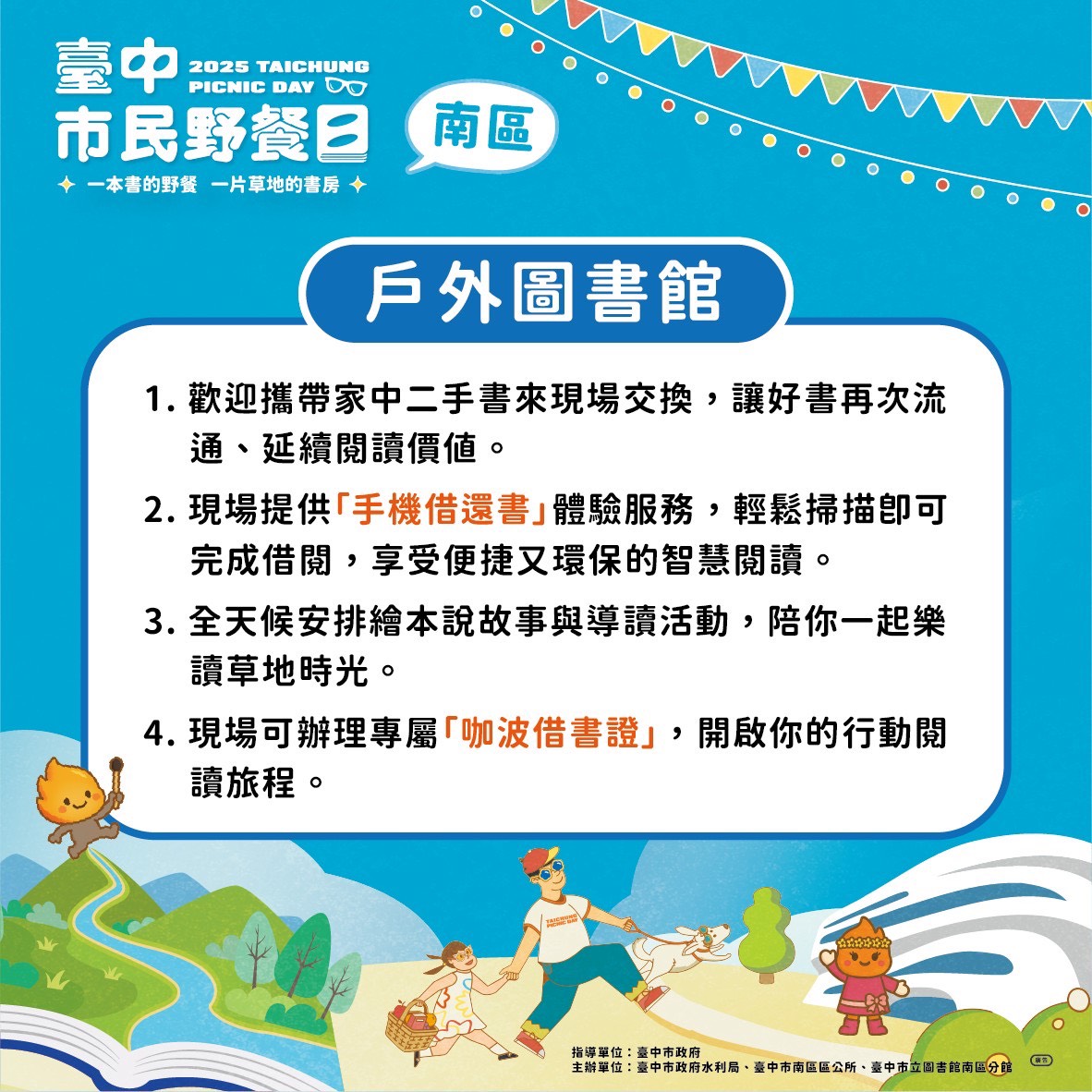 水利局提醒,為響應環保,請民眾自備野餐墊,並可攜帶防蚊用品及止癢藥。活動同時鼓勵大家帶家中二手書參加現場交換,體驗「手機借還書」的智慧借閱服務,並別錯過南區場次限定的「咖波借書證」現場辦理。
