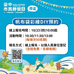 此外,現場特別規劃「帆布袋彩繪DIY體驗」,同樣於1023日上午10時起開放報名,全程免費、名額有限。活動共分三場次(1030分、1130分及13時),每場限額50人,讓參與者發揮創意,親手打造專屬野餐袋(報名連結:https://reurl.cc/rYMWWN)。當天上午1030分起還有「闖關集章拿好禮」活動,完成闖關者即可兌換限量「折疊野餐袋」一份,數量有限、換完為止,邀請市民一同挑戰、同樂。