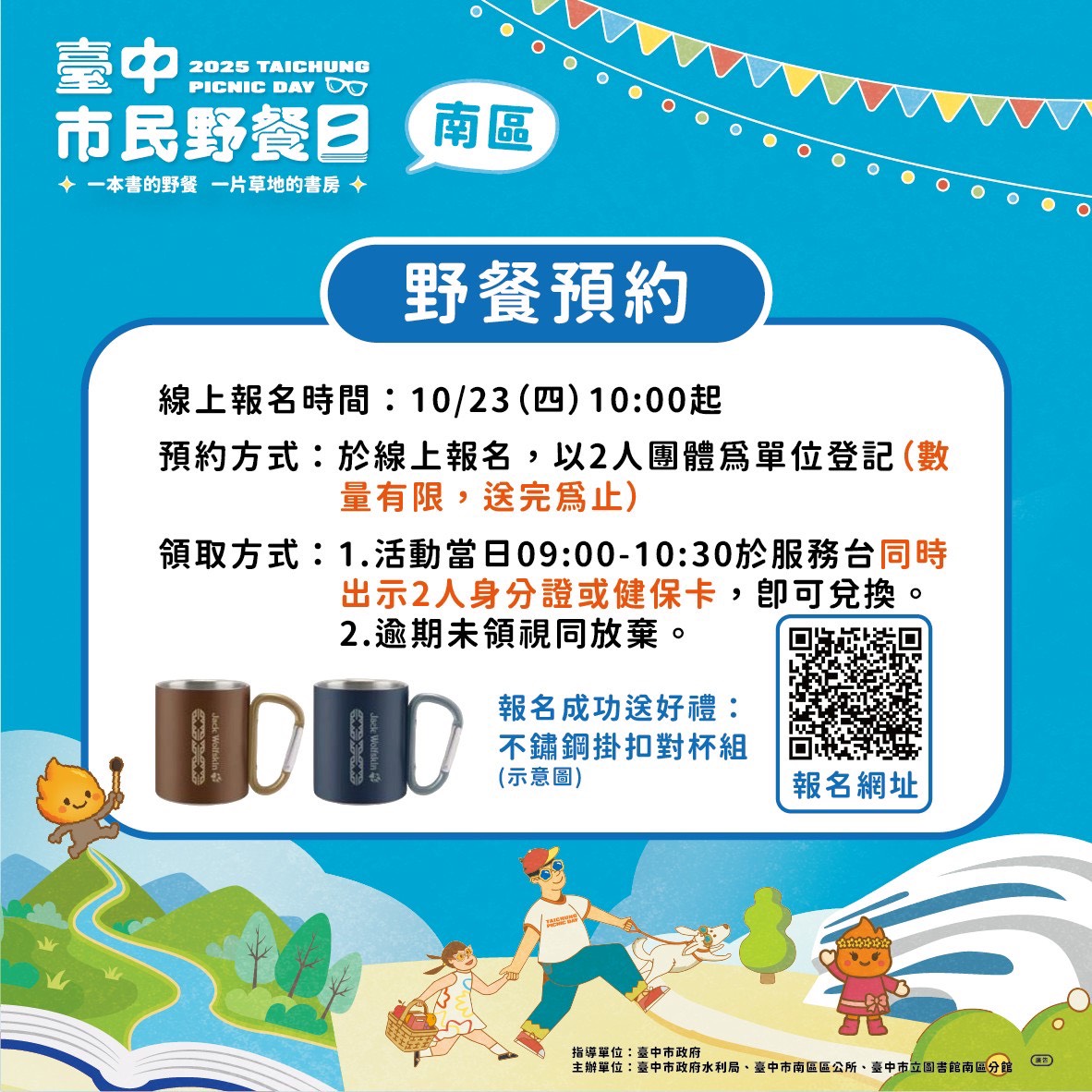 活動內容豐富多元,為市民帶來滿滿驚喜。野餐預約將於1023日(星期四)上午10時開放線上報名(https://reurl.cc/ZNpxxp),以兩人為一組參加,成功報名即可獲得「不銹鋼掛扣對杯組」一份,數量有限、送完為止。活動當日上午9時至1030分,參加者可憑雙方身分證或健保卡至服務台兌換。