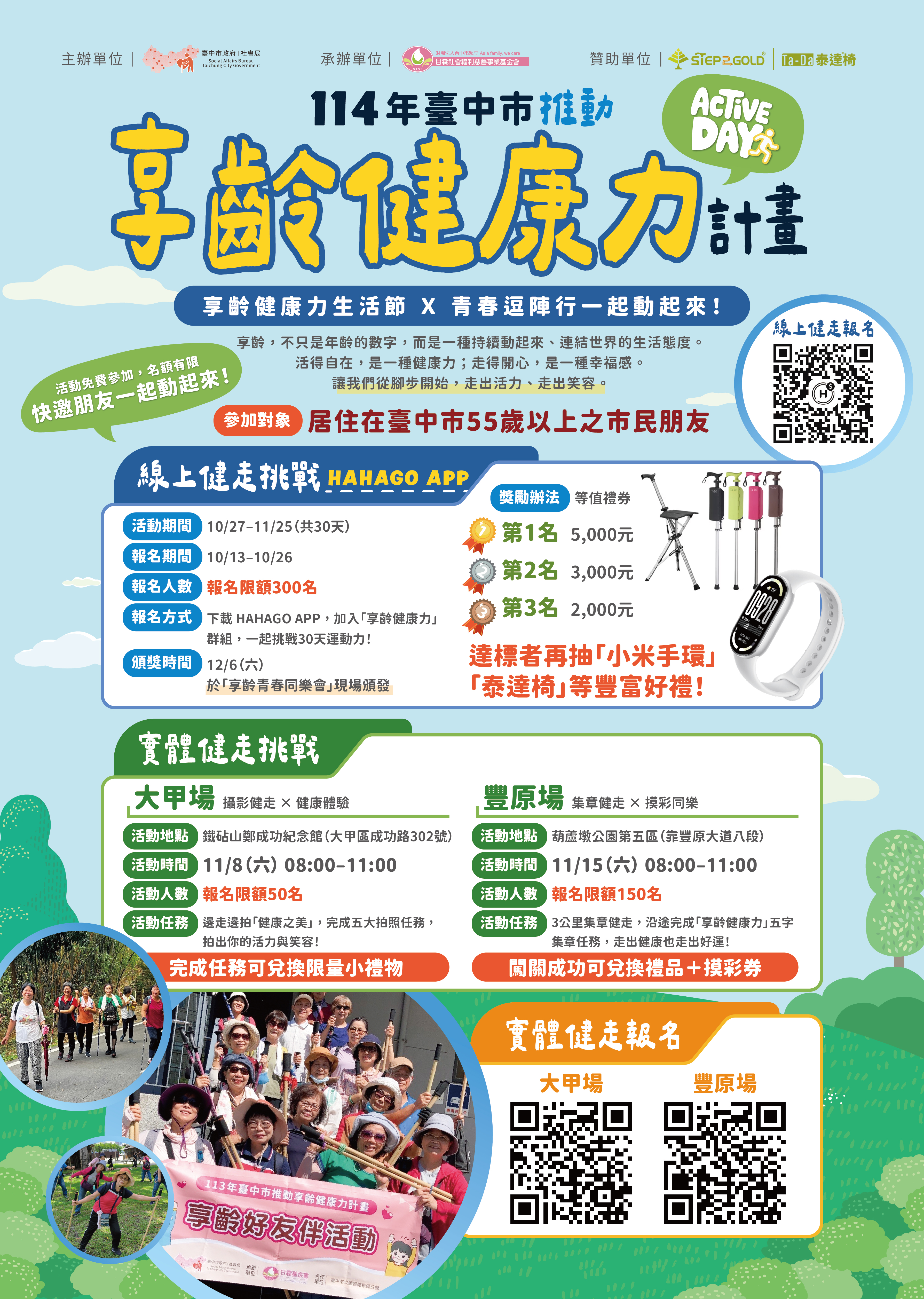 走出健康、走出快樂!台中市政府社會局「享齡健康力生活節」即日至10月26日開放報名,手機下載 HAHAGO APP加入線上健走,挑戰30日運動力,總步數前3名可獲得2,000元至5,000元等值禮券。11月8日在大甲鐵砧山鄭成功紀念館、11月15日在豐原葫蘆墩公園第五區,還有2場實體健走活動,名額有限,快把握機會報名。
