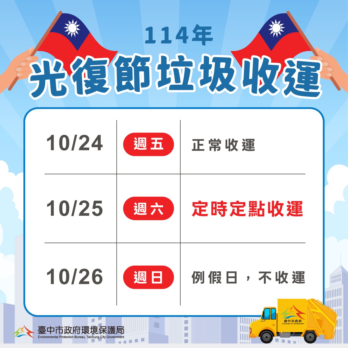 台灣光復節假期將至,台中市政府環保局為維持垃圾收運服務,10月24日維持正常沿街收運,10月25日台灣光復暨金門古寧頭大捷紀念日當日暫停沿街收運垃圾模式,改採「定時定點」垃圾收運服務,在全市廣設638處定點,每處停留時間約5至30分鐘,方便民眾倒垃圾,請市民提前掌握收運時間。