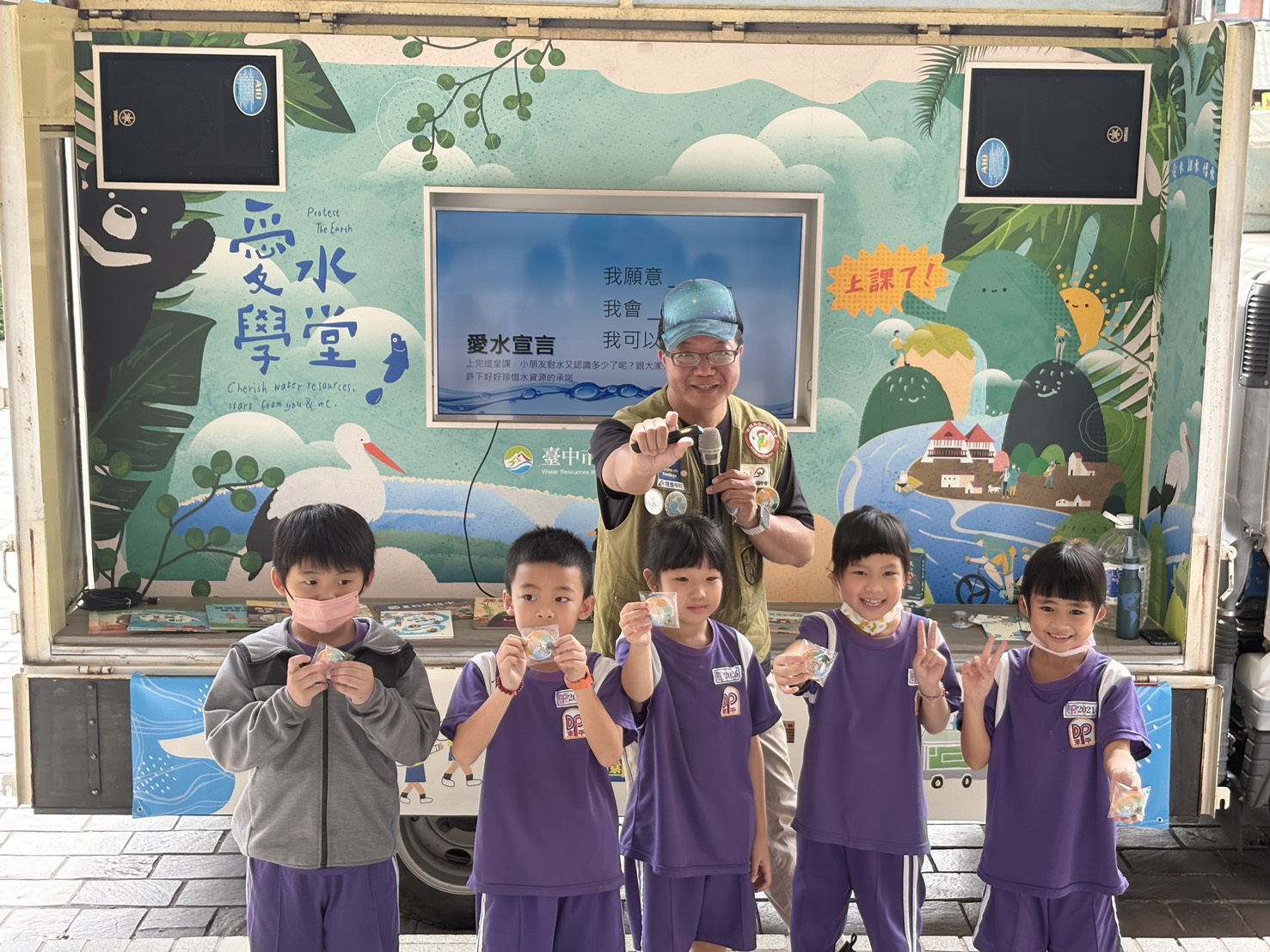 水利局說明在活動一開始,「愛水ㄅㄨㄅㄨ車」播放生動影片,介紹行動教育車的設計特色與推廣宗旨,讓同學們了解臺中市推動水環境教育的用心與成果。隨後導讀老師帶來精采故事與繪本導讀,以生動情節引導孩子們思考節水與環境保護的重要性,進一步培養珍惜水資源的好習慣。