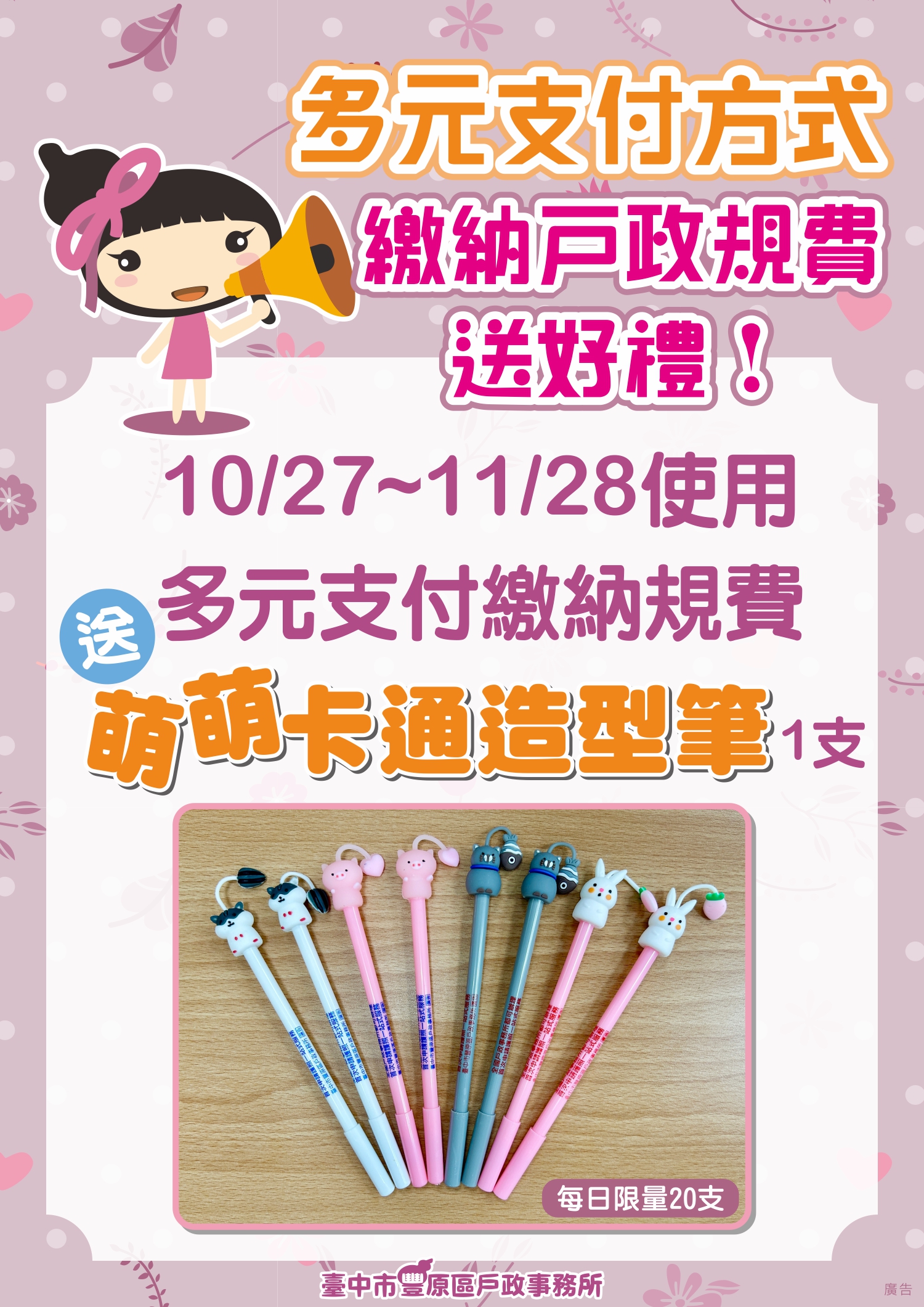 10/27~11/28使用多元支付繳納規費送「萌萌卡通造型筆」1支(