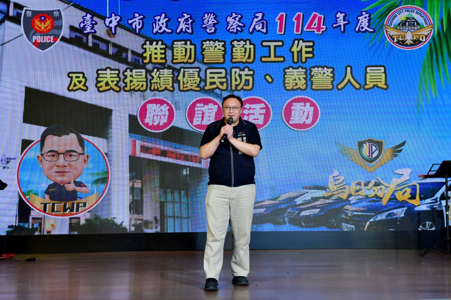 烏日分局轄區遼闊,包含烏日、大肚、龍井等3處行政區,共計有12個民防分隊、11個義警分隊,協勤民力合計561位。鄭副市長致詞時對於「烏大龍」地區民防、義警弟兄不求回報的默默付出表示敬意,感謝民防義警全年無休犧牲奉獻,協助維護台中市治安,是奠定大台中市安定的基石,希望警民永續合作,共同為轄區民眾提供最優質的服務。