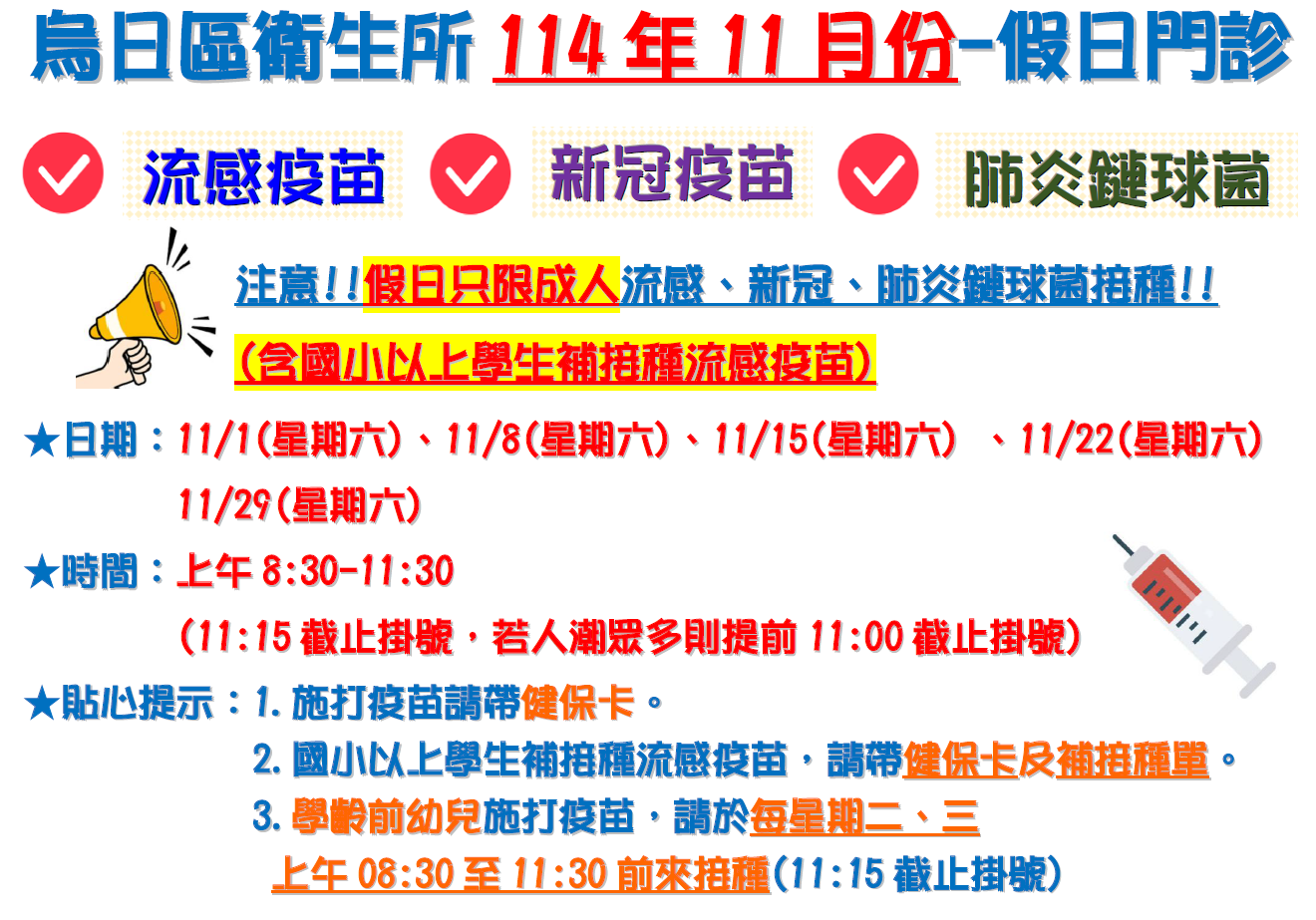 為方便民眾接種疫苗,本所於11月份加開假日流感、新冠疫苗及肺炎鏈球菌接種門診(假日只提供成人接種及國小以上學童補接種流感疫苗):